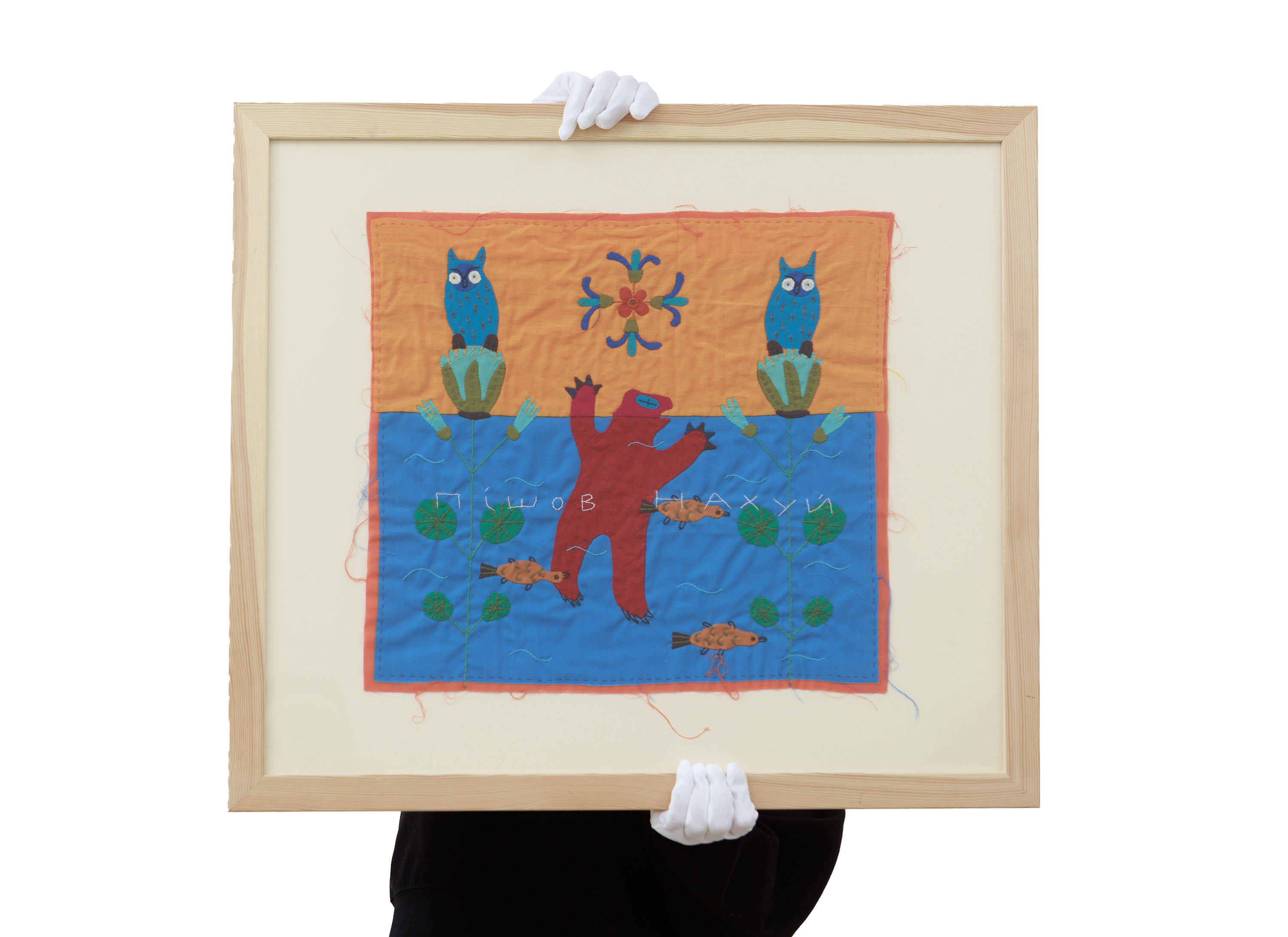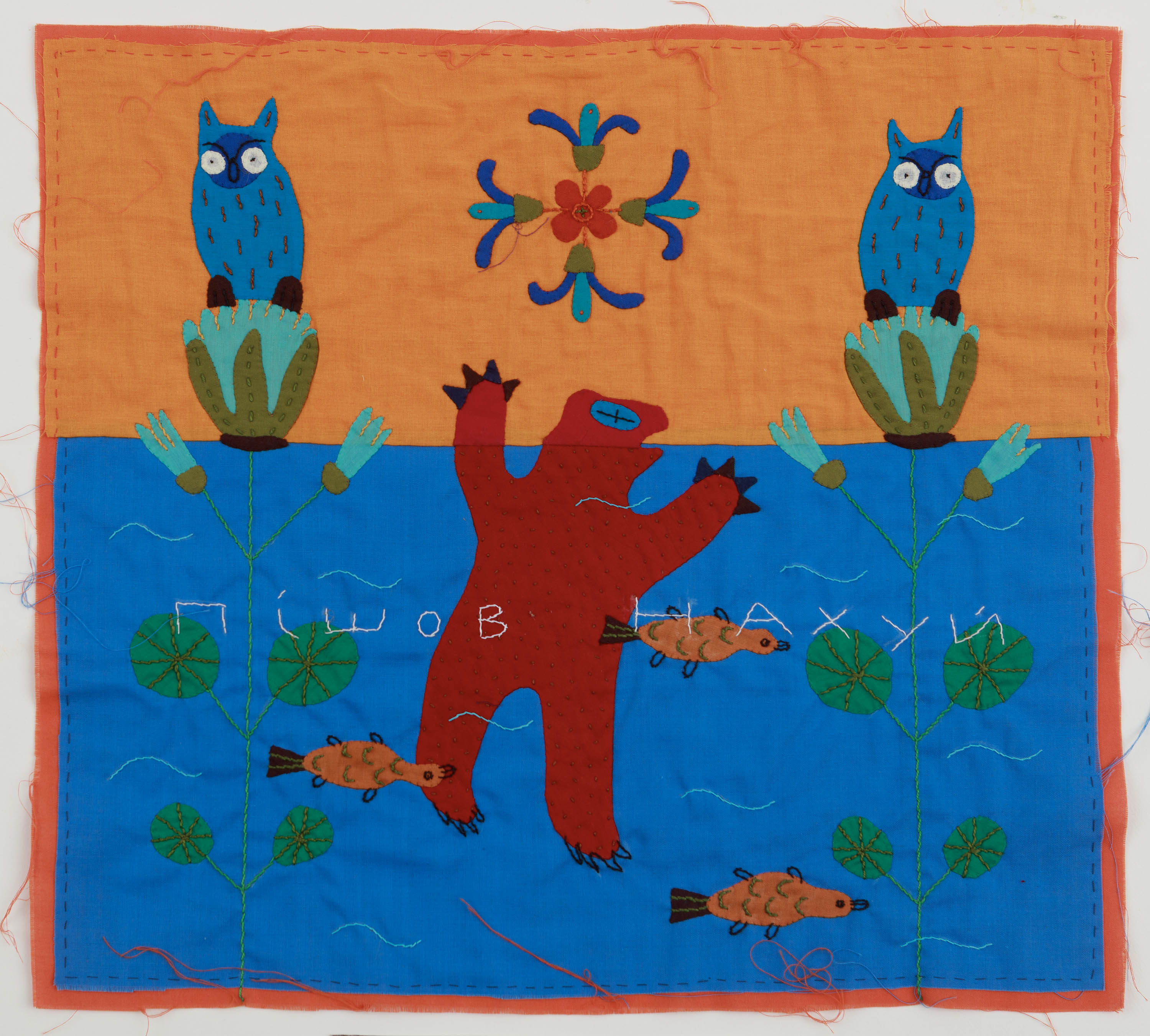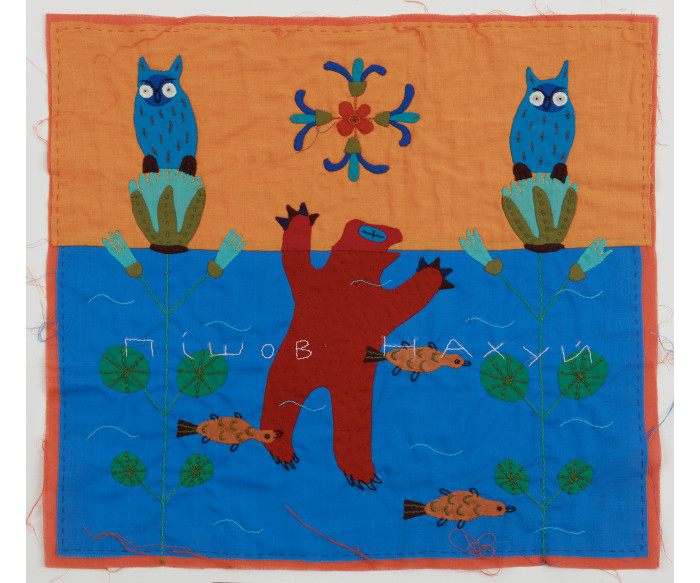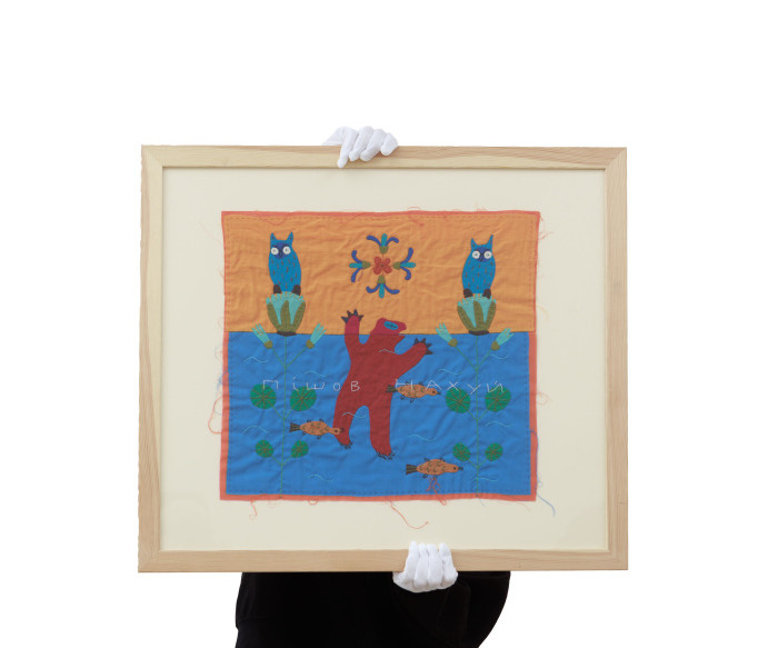 Textile applique, hand embroidery. 41 × 45 сm. Signed on the reverse