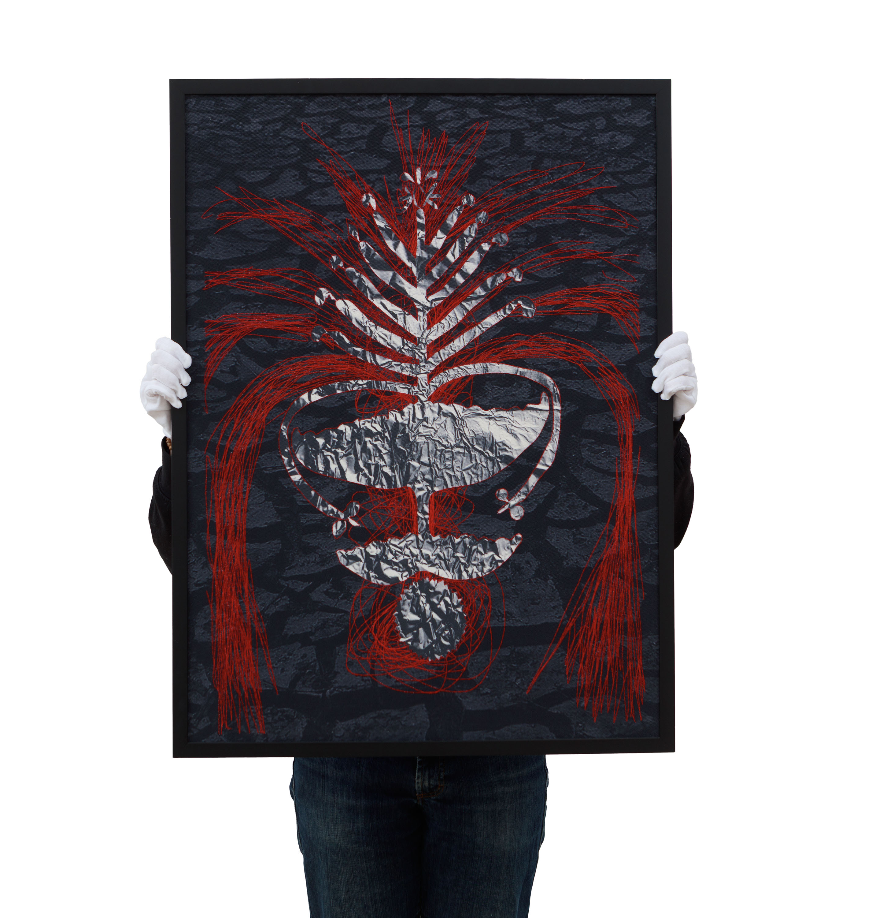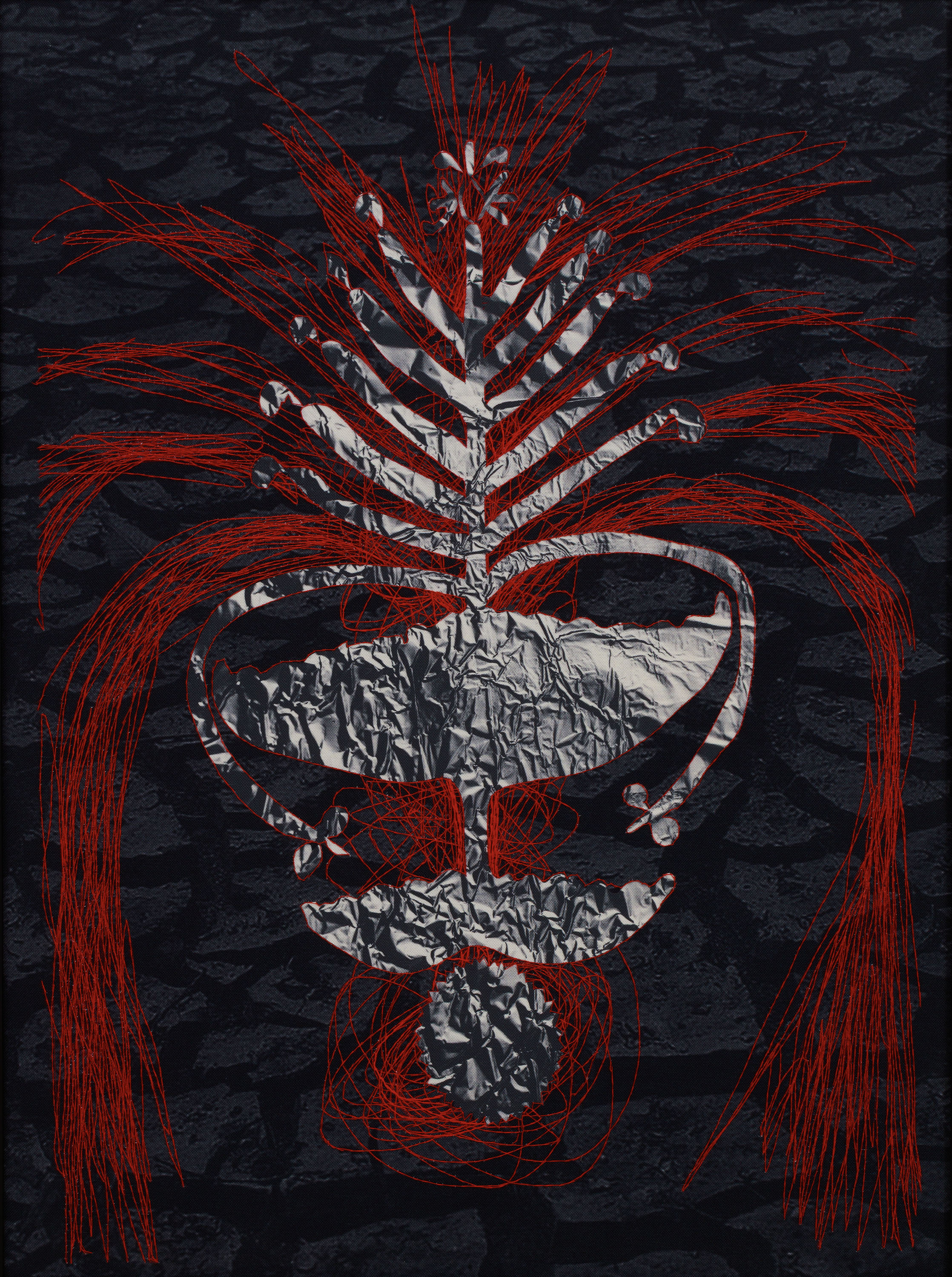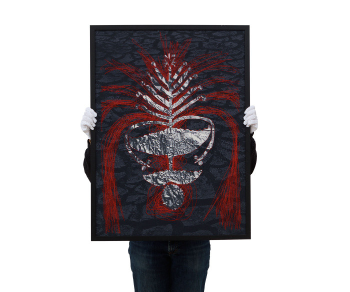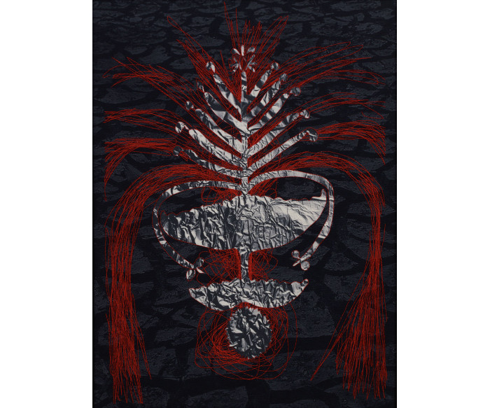 Fabric printing, hand embroidery. 84 × 63 сm. Signed on the reverse