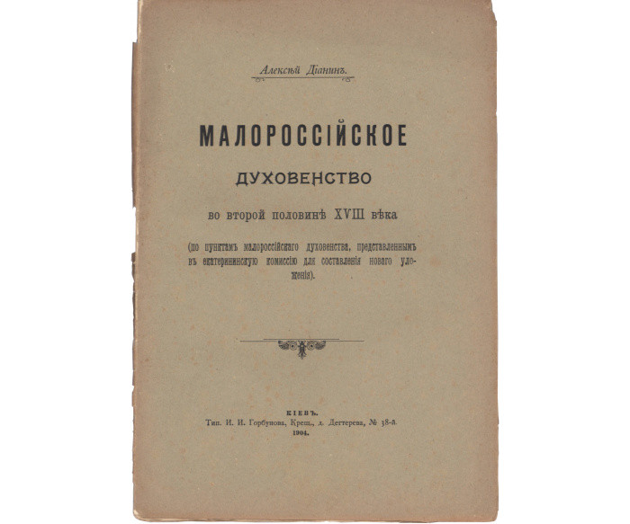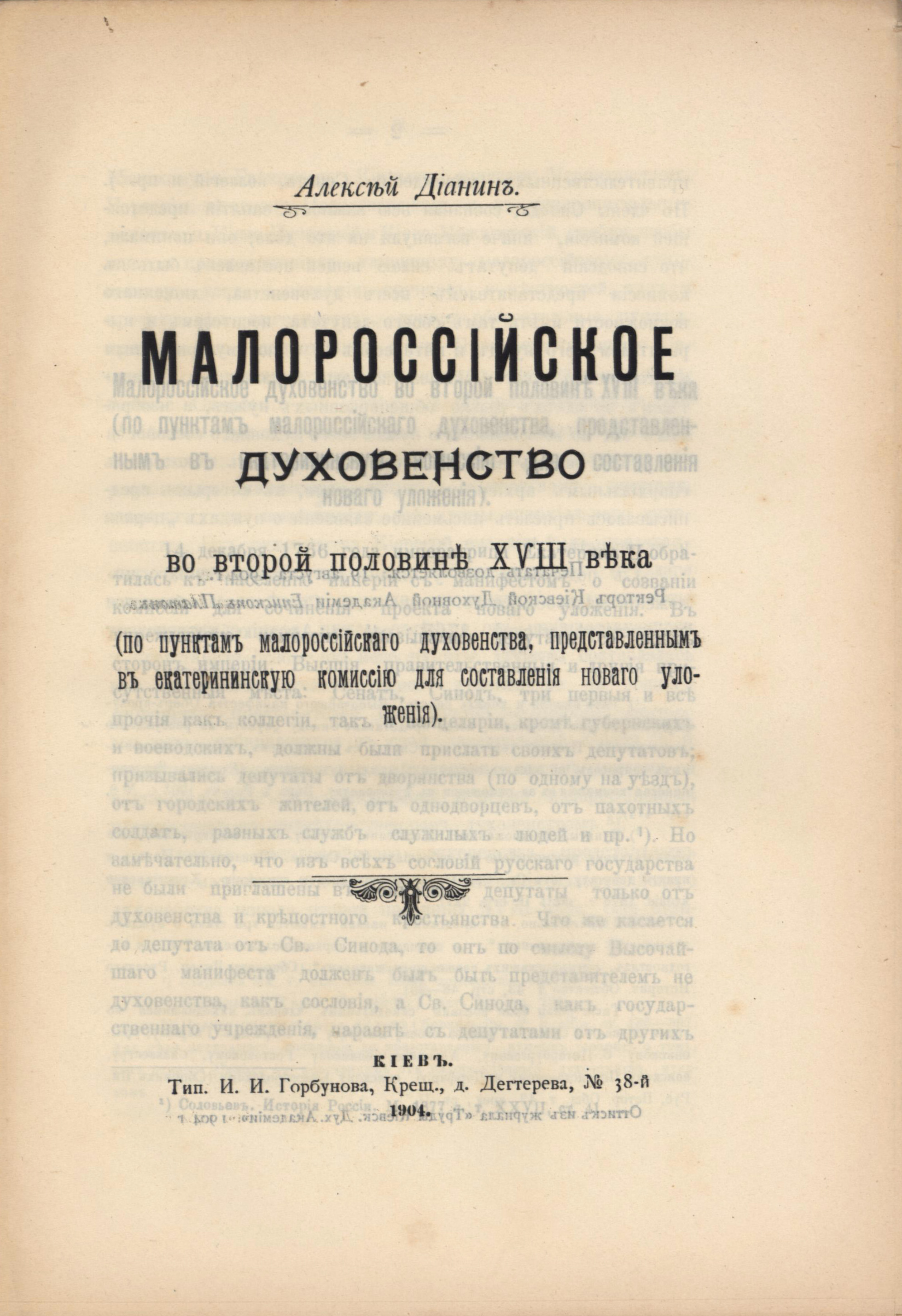 Діанинъ А. Малороссійское духовенство во второй половинѣ ХVIII вѣка (по пунктамъ малороссійскаго духовенства, представленнымъ въ екатерининскую комиссію для составленія новаго уложенія).
