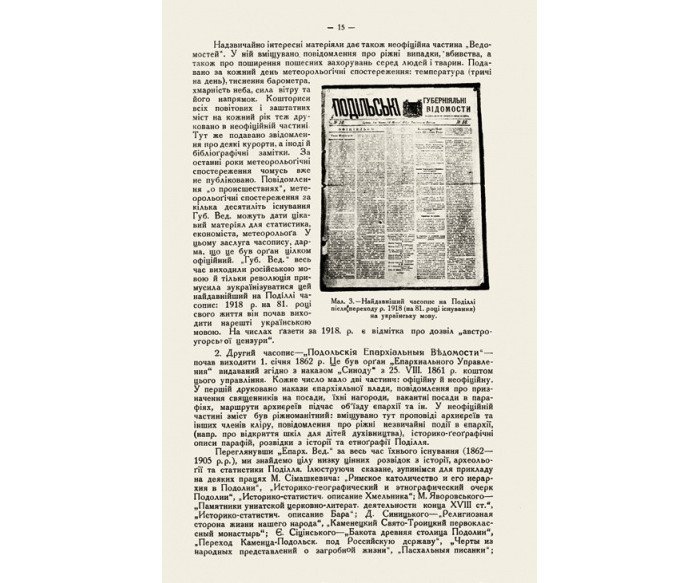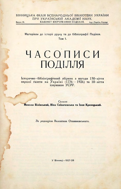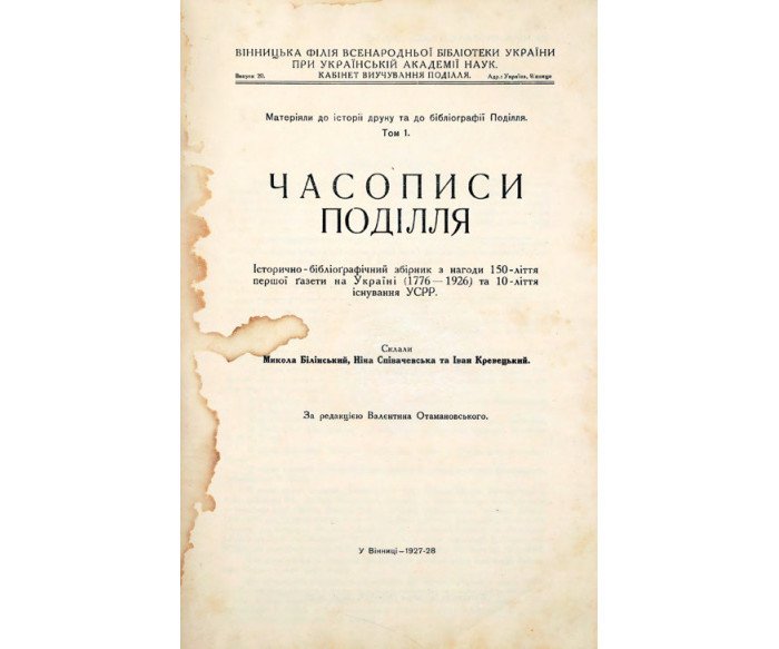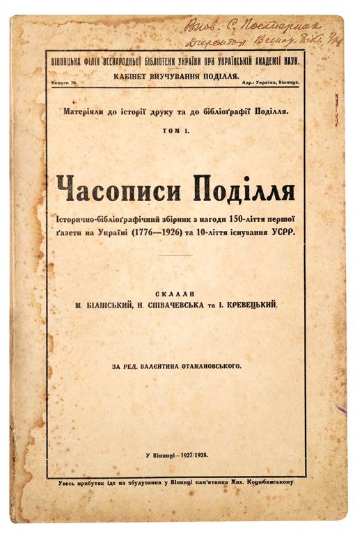 Історично-бібліоґрафічний збірник з нагоди 150-ліття першої газети на Україні (1776–1926) та 10-ліття існування УСРР / склали М. Білінський, Н. Співачевська, І. Кревецький; за ред. В. Отамановського / Вінницька філія Всенародньої бібліотеки України при Українській академії наук. Кабінет виучування Поділля. Вип. 20. Вінниця: Віндерждрук ім. Леніна. / Матеріяли до історії друку та до бібліоґрафії Поділля, т. 1. — VII, 31, 146, 21, 4, ІІІ с. — 26 × 17 × 1,3 см. В оригінальній обкладинці. Потертості, надриви та забруднення. На обкладинці напис «Впов. С. Пастернак Директор Всенар. бібл. Укр.». Видання має наукову та історико-культурну цінність.
