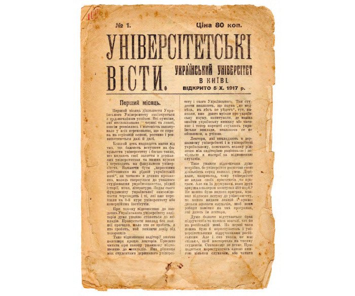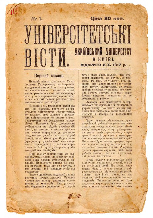 Український універсітет в Київі; відкрито 5 Х. 1917 р.; ред. і вид. О. С. Грушевський. [Київ]: Друкарня Українського наукового товариства. — 16 с. — 26 × 18 × 0,2 см. Пожовтіння паперу, надриви сторінок, плями від залиття. У лівому верх- ньому куті першої сторінки цифрова позначка. Видання має наукову, історико-культурну цінність і становить колекційний інтерес. Бібліографічна рідкість. Випуск перший і єдиний.