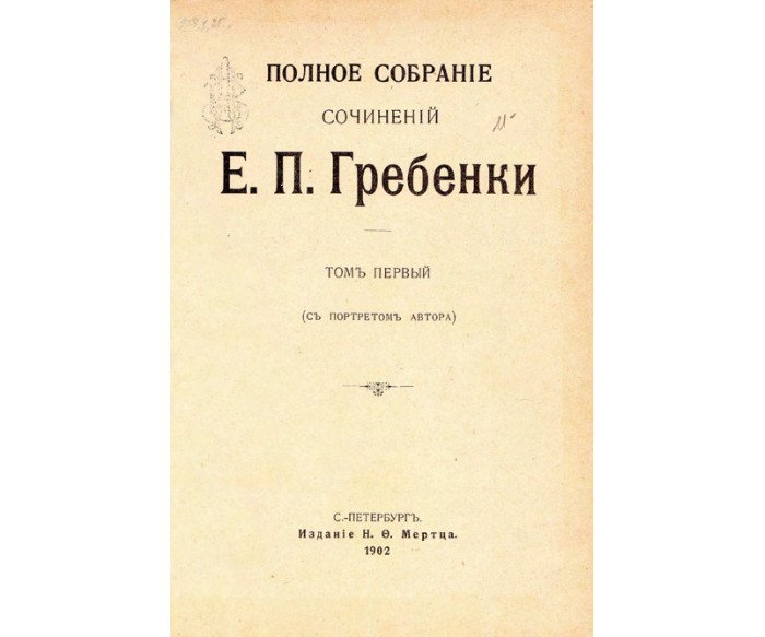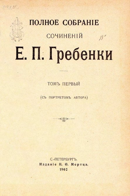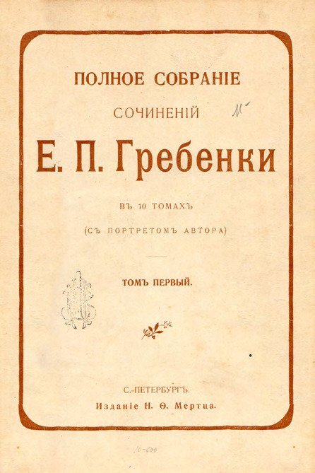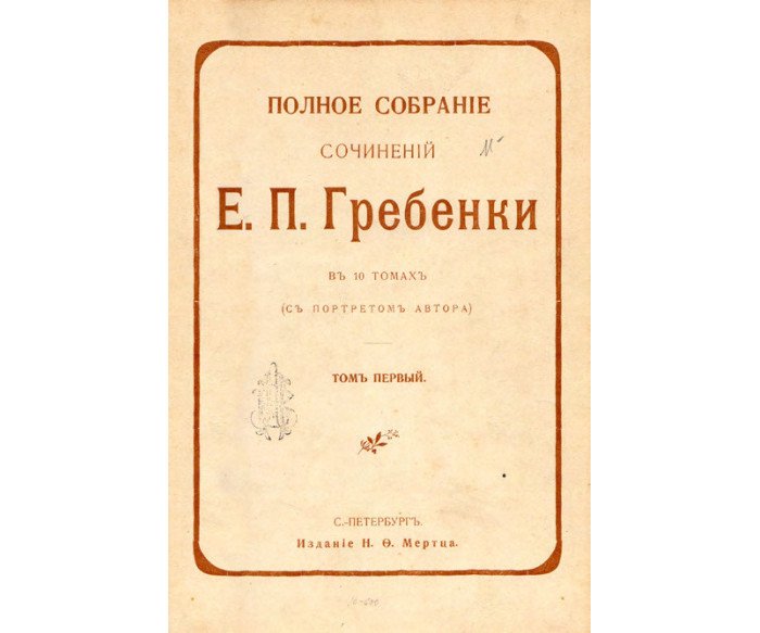 Въ 10 т. (съ портретом автора). — Т. І–Х. С.-Петербургъ: Ізданіе Н. Ф. Мертца; типографія «В. С. Балашевъ и Ко». [І кн.] Т. І–V: [3] л., ХVI, 147, [2] с.; [1] л., 157, [2] c.; [1] л., 161, [2] с.; [1] л., 162, [2] с.; [1] л., 188, [2] с.: портр. — 21,1 × 14 × 4,1 см. [ІІ кн.] Т. VI–X: [1] л., 127, [2] с.; [1] л., 157, [2] с.; [1] л., 155, [2] с.; [1] л., 131, [2] с.; [1] л., 171, [5] с. — 21,1 × 14 × 3,5 см. В індивідуальних складених (шкіра, коленкор) палітурах. Незначні потертості та забруднення. Позначки кульковою ручкою. У першому томі вміщено портрет Є. Гребінки. Наприкінці другої книги вірш кульковою ручкою. Видання має наукову, історико-культурну цінність і становить колекційний інтерес.