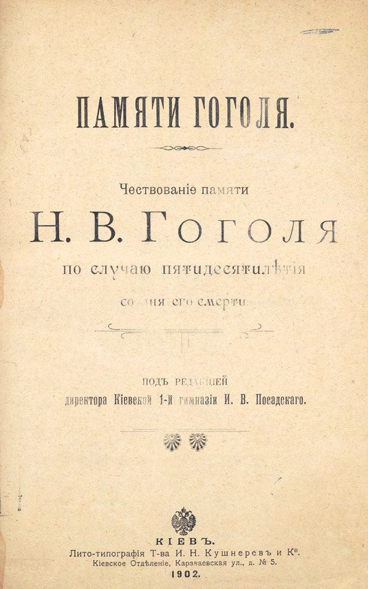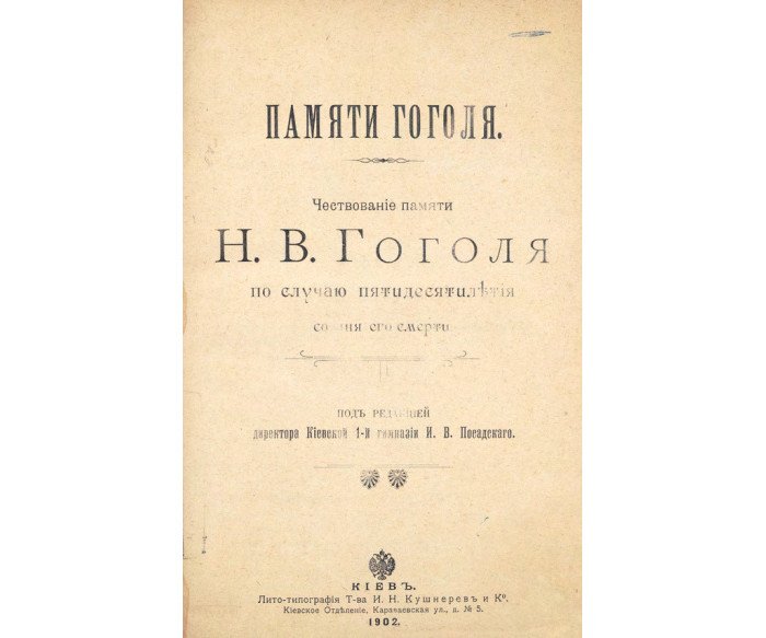 Чествованіе памяти Н. В. Гоголя по случаю пятидесятилѣтія со дня его смерти / подъ ред. И. В. Посадскаго. Кіевъ: Лито-типографія Т-ва И. Н. Кушнеревъ и Ко. — IV с., VI с., 504 с. — 21,3 × 15,3 × 2,8 см. В індивідуальній складеній («мармуровий» папір, шкіра) палітурі. Потертості та забруднення палітури. Пошкодження корінця. Пожовтіння паперу. Видання має наукову, історико-культурну цінність і становить колекційний інтерес.