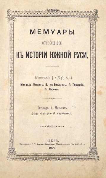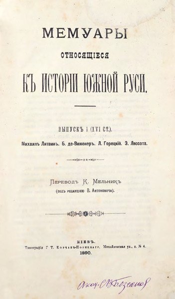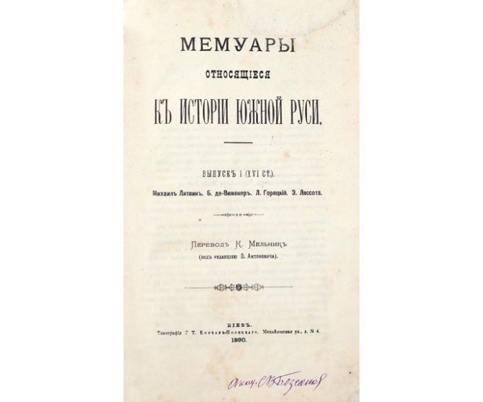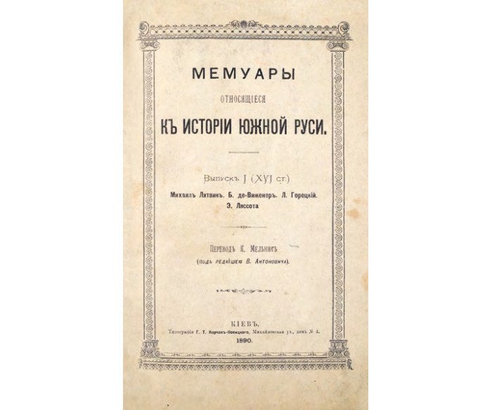 800 — 1 000Перший випуск збірки містить унікальні записи відомих іноземних дипломатів і мемуаристів, очевидців історичних подій в Україні XVI ст. — М. Литвина, Б. де Віженера, Л. Горецького, Е. Лясоти. Другий випуск, в якому згадуються події першої половини XVII ст., вийшов у 1896 році. Мемуари публікувалися під редакцією видатного українського історика, археолога, професора Київського університету Володимира Антоновича (1834–1908).
