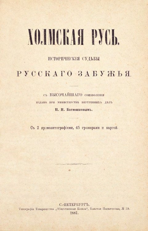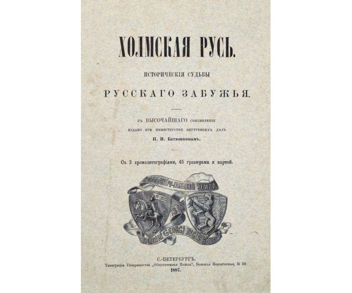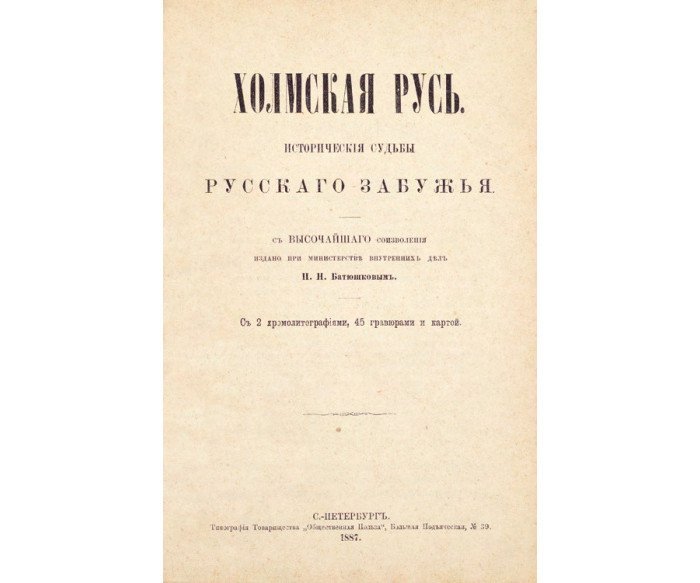 900 — 1 100Перше видання книги «Холмская Русь. Историческія судьбы русскаго Забужья», головною метою якої був максимально докладний опис долі Забужжя в контексті історичного шляху західних областей Російської імперії. Видання містить унікальні ілюстрації — копію з фрески св. Володимира XII ст., портрети Петра I, Катерини II, Миколи I, Петра Могили, графа Д. Толстого та ін.