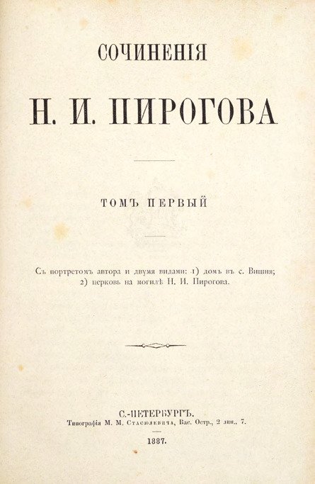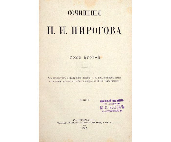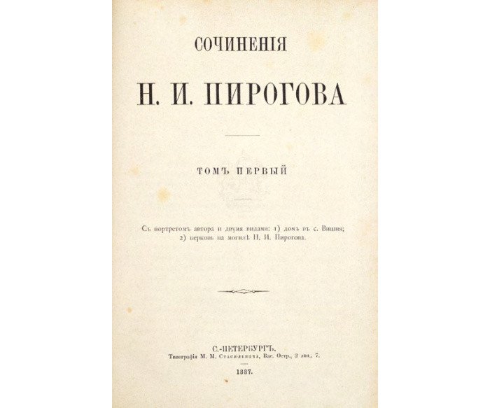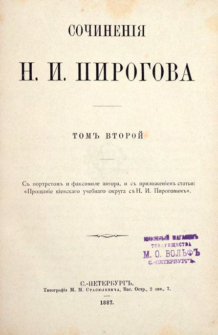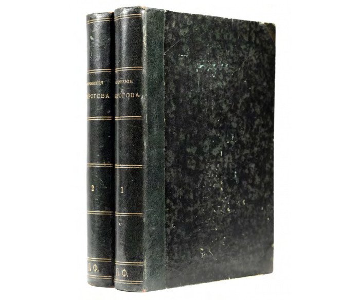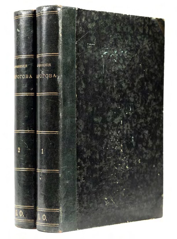 С.-Петербургъ: Типографія М. М. Стасюлевича. Т. І. Съ портретомъ автора и двумя видами: 1) домъ въ с. Вишня; 2) церковь на могилѣ Н. И. Пирогова. — [1] л., VII, 527 с., [2] л. илл.: фронтиспис, илл. — 22 × 15 × 3,1 см. Т. ІІ. Съ портретомъ и факсимиле автора, и съ приложеніемъ статьи: «Прощаніе кіевскаго учебнаго округа съ Н. И. Пироговымъ». — [1] л., VII, 554 с.: фронтиспис. — 22 × 14,9 × 3,2 см. В індивідуальних шкіряних палітурах. Незначні потертості та забруднення. Суперекслібрис «П. Ф.». На форзаці напис чорнилом «П. Философовъ». У другому томі печатка «Книжный магазин товарищества М. О. Вольфъ С.-Петербург». Книги мають наукову, художню, історико-культурну цінність і становлять колекційний інтерес. Бібліографічна рідкість.