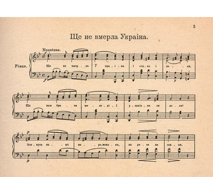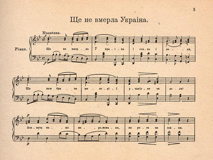 «Рідна мова» тощо. Збірка відкривається піснею «Ще не вмерла Україна». Автор музики — західноукраїнський композитор і диригент, один із організаторів культурного й духовного життя в Західній Україні Михайло Вербицький (1815–1870). Автор слів — Павло Чубинський (1839–1884). Точна дата написання тексту невідома, деякі джерела вказують на 1862 р. Твір почав своє нелегальне існування в межах царської Росії як патріотично-
