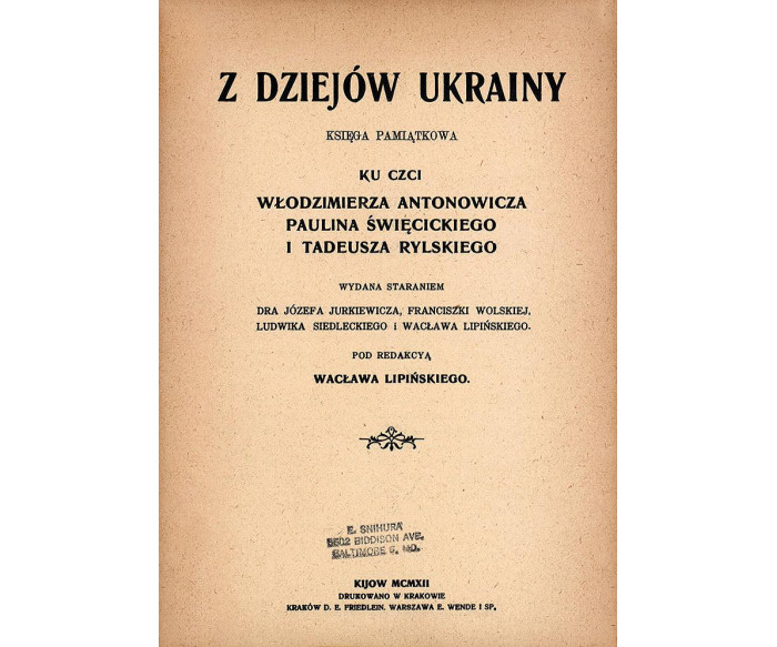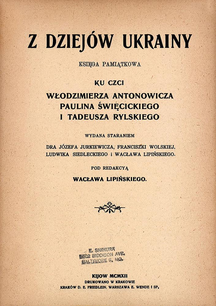Z dziejо́w Ukrainy. Кsięga pamiątkowa ku czci Włodzimierza Antonowicza, Paulina Święcickiego i Tadeusza Rylskiego. / pod red. W. Lipińskiego.