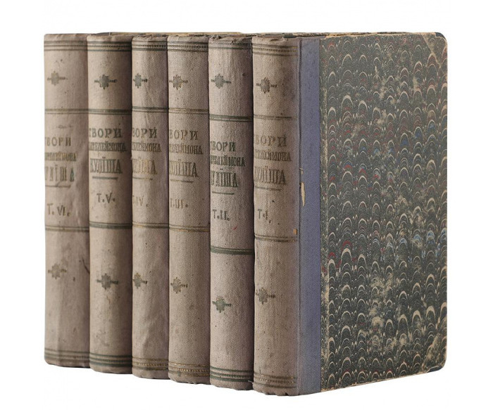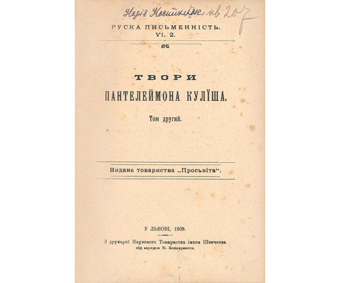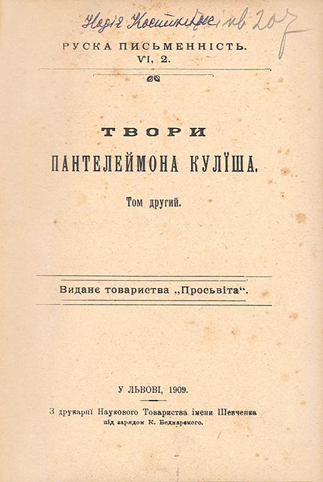 Львів: «Просьвіта»; З друкарнї Наукового Товариства ім. Шевченка; під зарядом К. Беднарського. — 5000 прим. Т. І: 1908. — 502 с., [1] арк.: портр. / Руска письменність, VI, 1. — 16,6 × 11,9 × 2,4 см. Т.ІІ: 1909 / Руска письменність, VI, 2. — 560 с.: портр. — 16,5 × 11,5 × 2,5 см. Т.ІІІ: 1909 / Руска письменність, VI, 3. — 576 с.: портр.— 16,6 × 11,3 × 2,5 см. Т. IV: 1909 / Руска письменність, VI, 4. — 528 с.: портр. — 16,8 × 11,5 × 2,8 см. Т.V: 1910 / Руска письменність, VI, 5. — 560 с.: іл. — 16,5 × 11,5 × 2,5 см. Т.VI: 1910 / Руска письменність, VI, 6. — 700 с.: іл. — 16,6 × 11,2 × 3,2 см.