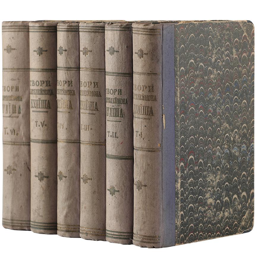 В індивідуальних складених (шкіра, «мармуровий» папір) палітурах. Незначні потертості та забруднення. Передмова Юліана Романчука. Містить портрети П. Куліша різних років. На титульному аркуші підпис «Надія Костинюк». У V томі з блоку випадають перші зошити.