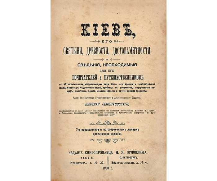 Кіевъ: Тип. С. В. Кульженко; Изданіе книгопродавца Н. Я. Оглобина. — 7-е исправленное и по современнымъ даннымъ дополненное изданіе. — [1] л., VI, [2] л., ХІ–ХVI, 300 с., [4] л.: илл., карты. — 20,5 × 14 × 1,7 см.