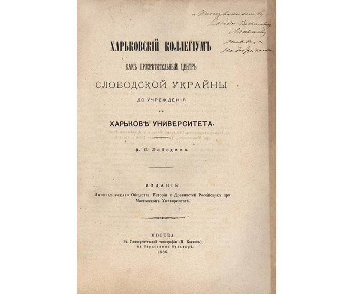 Харьковскій коллегіумъ какъ Просвѣтительный центръ Слободской Украйны до учрежденія въ Харьковѣ университета / А. С. Лебедева.