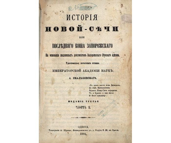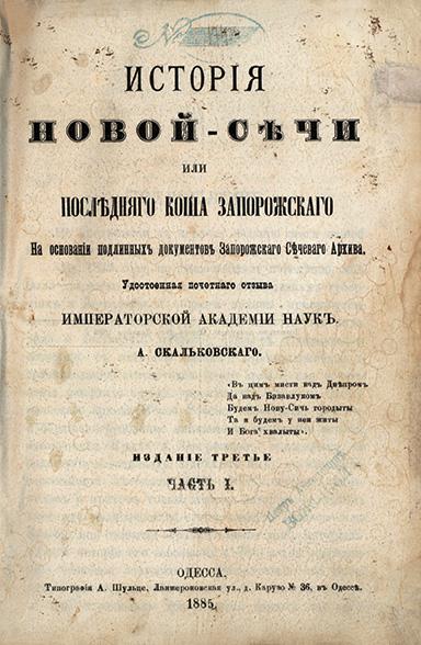 / на основаніи подлинныхъ документовъ Запорожскаго Сѣчеваго Архива. А. Скальковскаго:в 3 ч. Ч. І–ІІІ.