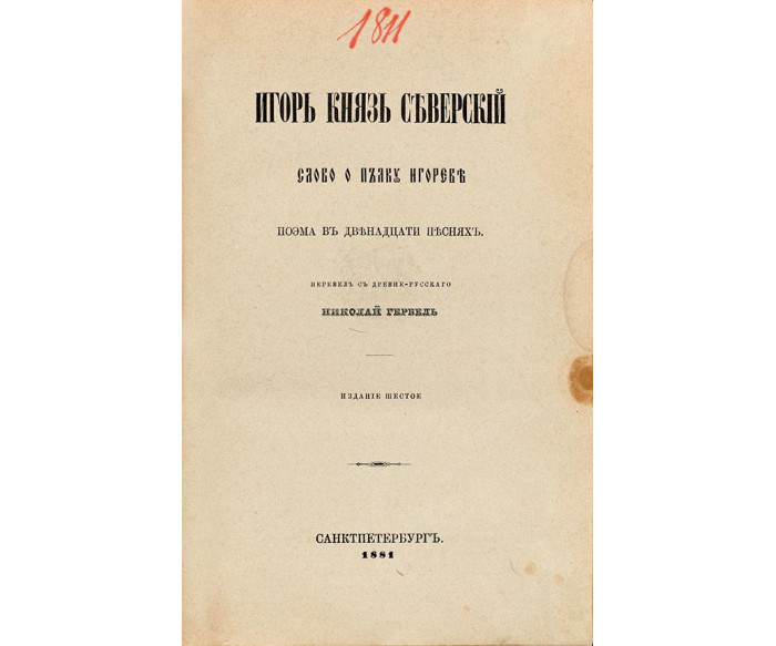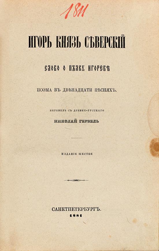 Игорь князь Сѣверскій. Слово о пълку Игорєвѣ: поэма въ двѣнадцати пѣсняхъ / перевелъ съ древне-русскаго Николай Гербель.