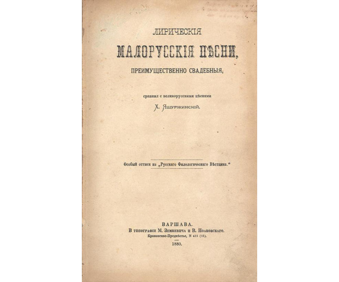 [Ящуржинскій Х.] Лирическія малорусскія пѣсни, преимущесвенно свадебныя.