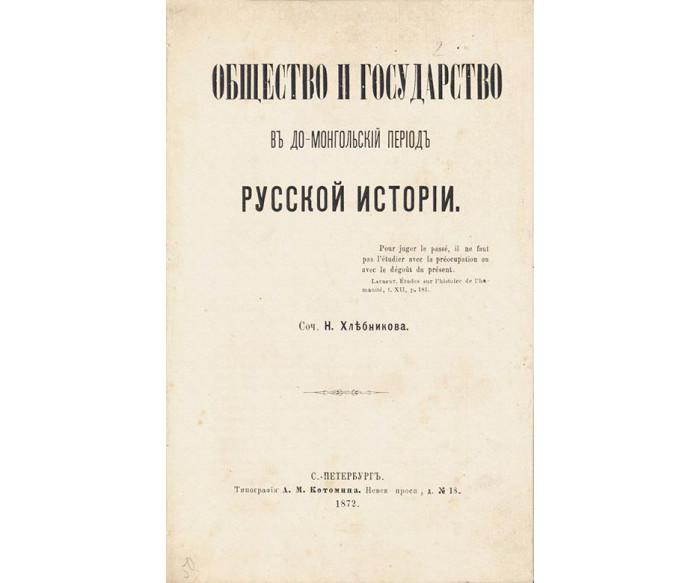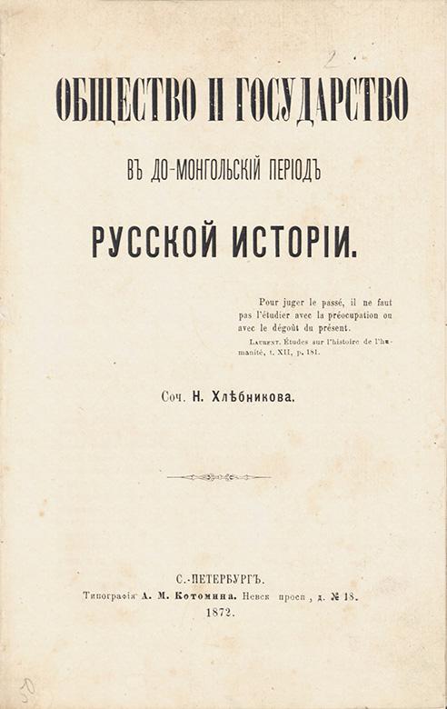 Общество и государство въ до-монгольскій періодъ русской исторіи / соч. Н. Хлѣбникова..