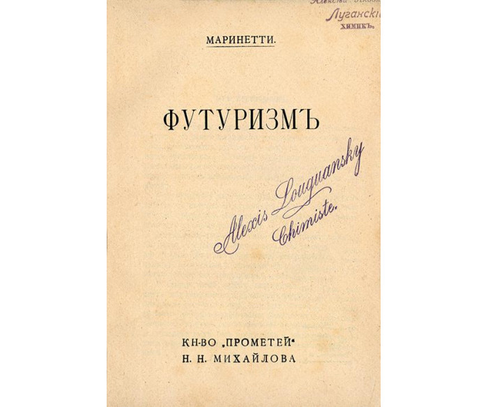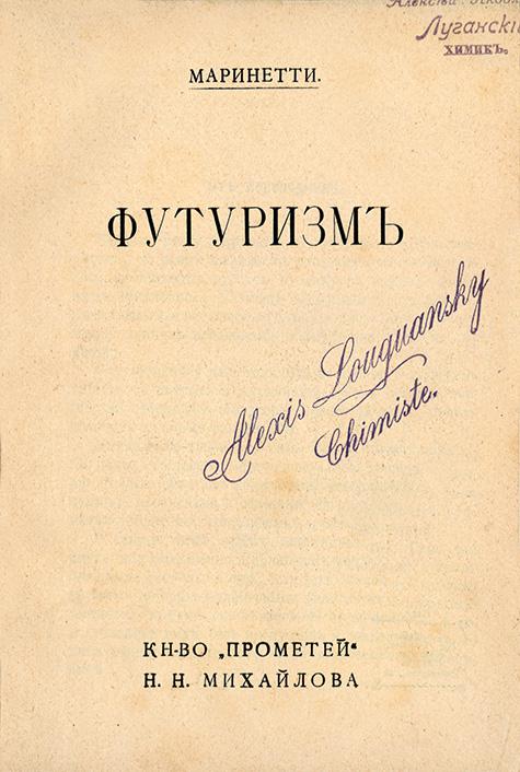 В індивідуальній складеній (шкіра, «мармуровий» папір) палітурі. Футляр. Незначні потертості та забруднення. Печатки «Alexis Louguansky», «Алексѣй Яковлев. Луганскій Химикъ». Містить портрет Філіппо Томмазо Марінетті. Передмова Михайла Енгельгардта.