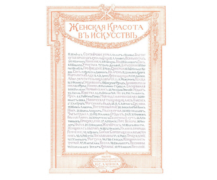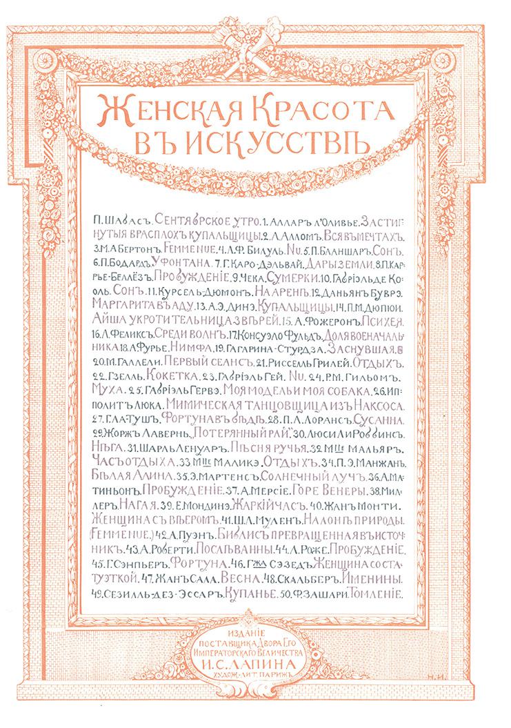 Парижъ: Изданіе поставщика двора Его Императорскаго Величества И.С. Лапина, [1913]. — [1] л., VI c., [51] л. поясн., [51] л. илл. — 42,5×32,5 × 2,5 см.