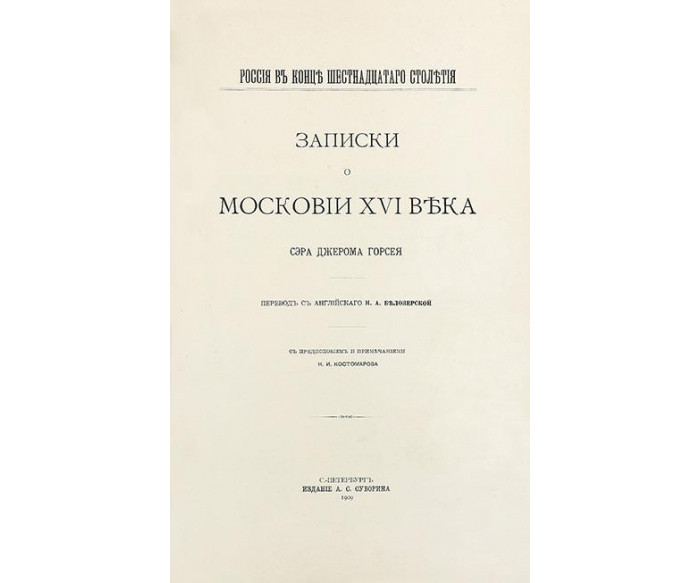 Перше видання повного перекладу твору «Записки о Московіи XVI вѣка» Джерома Горсея, вперше виданого у 1856 р., з передмовою