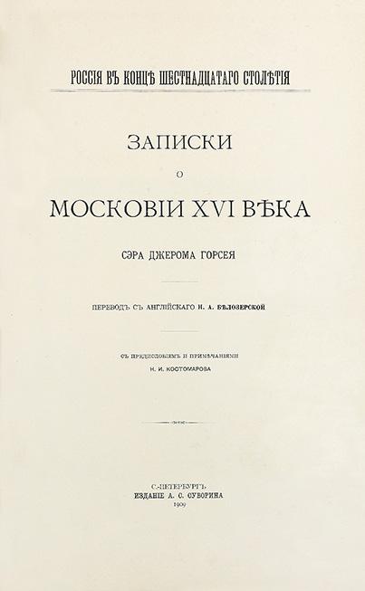 і примітками Миколи Костомарова. Переклад здійснила дружина Василя Білозерського, українська перекладачка Надія Білозерська (1828–1912). Англійський дипломат Джером Горсей (1550–1626) відомий як автор кількох творів про Росію, де жив у 70-90-ті рр. XVI ст., займаючись комерційною та дипломатичною службою. Його «Записки…» припадають на період царювання Івана Грозного (1530–1584). Автор докладно передає власні спостереження, при цьому мимохідь описуючи риси тодішнього російського побуту.