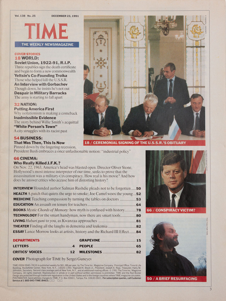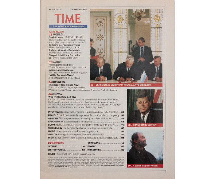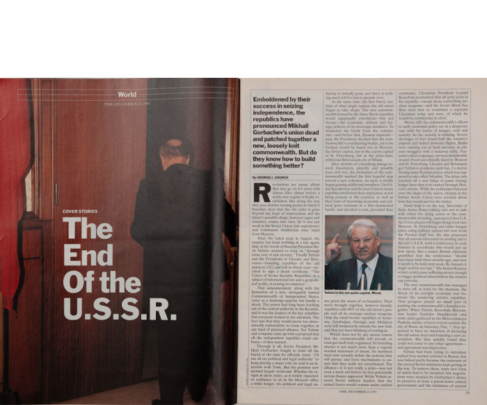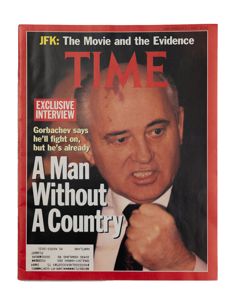 Номер американського журналу «TIME» від 23 грудня 1991 року, що містить ексклюзивне інтерв’ю першого президента СРСР Михайла Горбачова (1931–2022) «Людина без країни. Кінець СРСР», вийшов за два дні до того, як М. Горбачов у телевізійному зверненні склав із себе повноваження глави держави, і Радянський Союз припинив своє існування. У випуску зокрема йдеться про нову співдружність країн, роль і майбутнє України.
