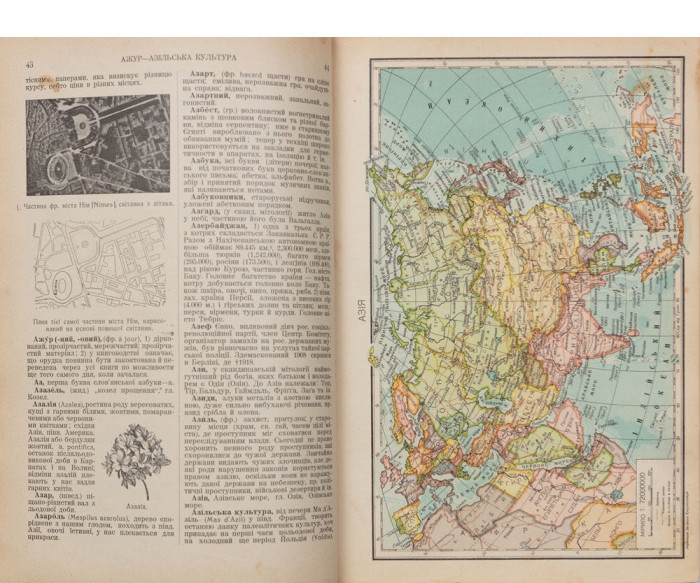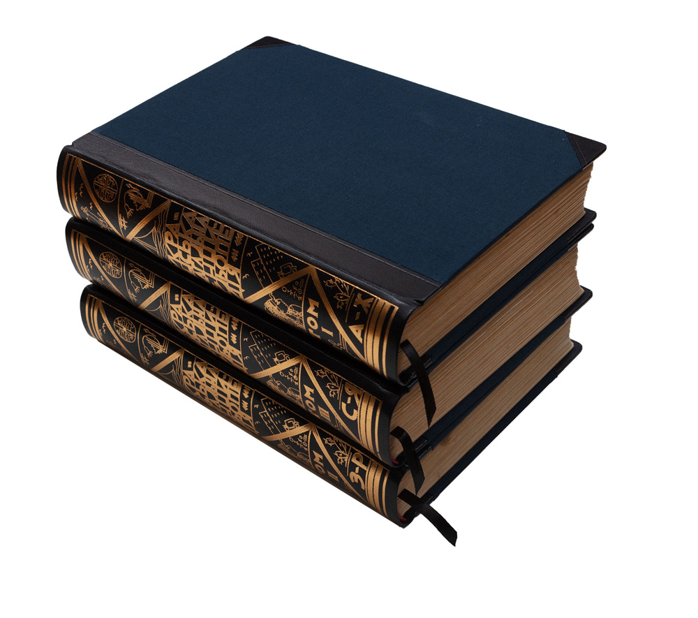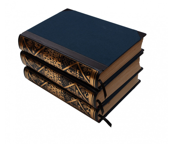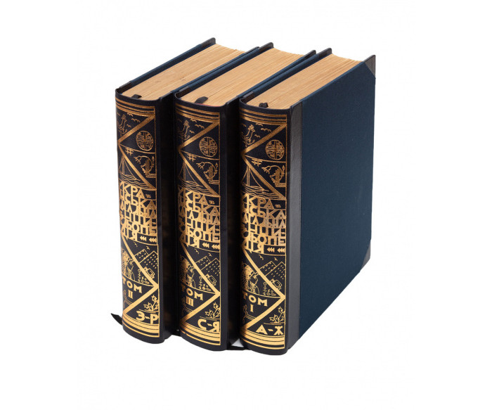 В індивідуальних художніх складених («мармуровий» папір, коленкор) палітурах. Орнаментально-шрифтове тиснення золотом на корінцях. Незначні потертості та забруднення. Ілюстраційні таблиці виконав Ф. А. Брокгавз у Ляйпціґу, а друк кольорових географічних мап Піллєр Найман у Львові; репродукції текстових ілюстрацій з клішарні «Фототип» у Львові. На титульних аркушах підпис [«О. Чемеринський»]. У т. 3 відсутня карта густоти населення України.