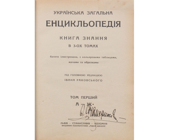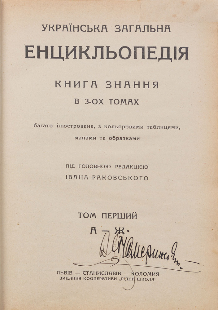 Львів — Станіславів — Коломия: вид. кооперативи «Рідна школа», 1930–1933. Т. 1: А–Ж. — Друк. Повітового союзу кооператив у Станіславові. — [4] арк., 1312 стовбц., [14] арк. іл.: іл., табл., карти. — 25 × 17,4 × 4 см. Т. 2: З–Р. — Союзна друкарня у Станиславові. — [2] арк., 1312 стовбц., [22] арк. іл.: іл., табл., карти. — 25 × 17,5 × 4,1 см. Т. 3: С–Я. — Союзна друкарня у Станиславові. — [2] арк., 1422 стовбц., [2] арк., [25] арк.: іл., табл., карти. — 24,5 × 17,4 × 4,6 см.