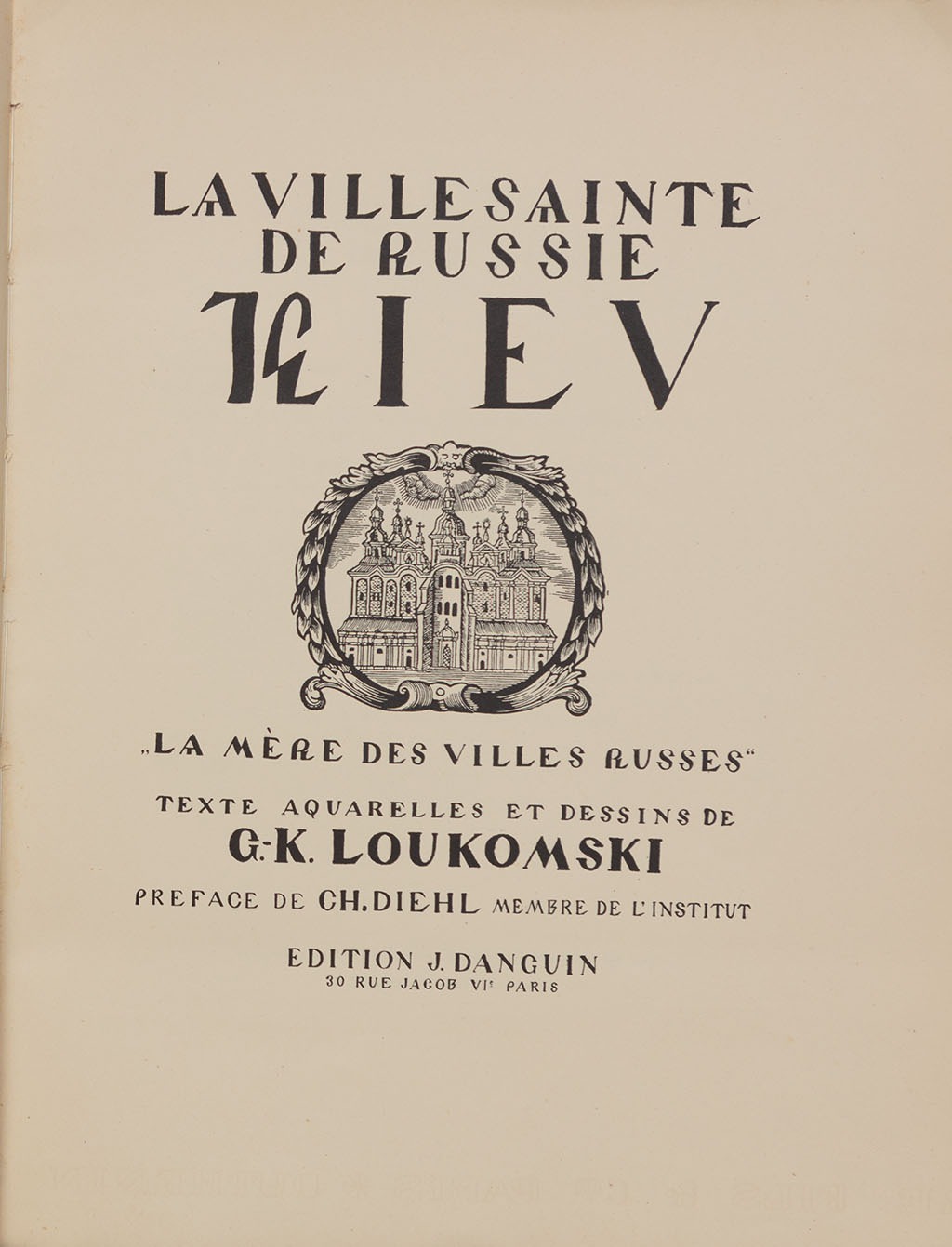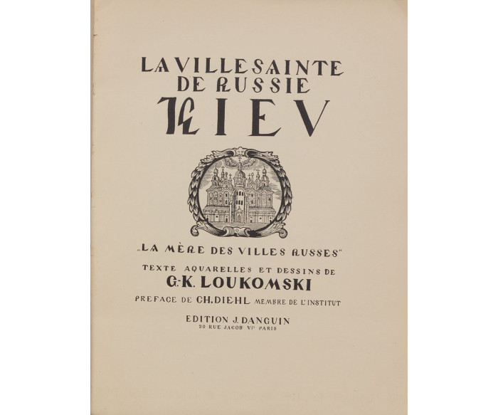 = Лукомський Г. Київ — святе місто Русі. «Мати міст руських». Його історія, монастирі, мозаїки та фрески, твори мистецтва. Aquarelles et dessins de l’auteur; preface de Ch. Diehl membre de L’Institut. = Акварелі та рисунки автора; передмова Ш. Діля, члена Інституту. Paris: J. Danguin, 1929. — XVI, 124 c., XVI арк. іл. на окр. вкл., 64 арк. фото: іл. — 32,5 × 25,5 × 2,5 см.