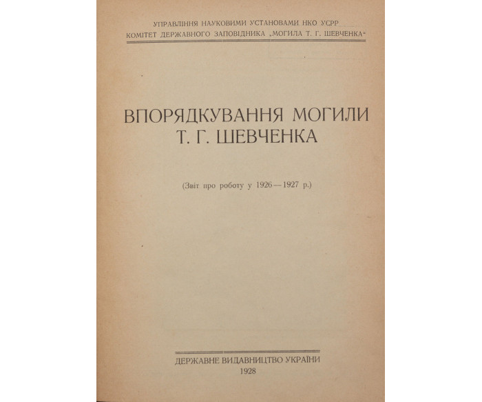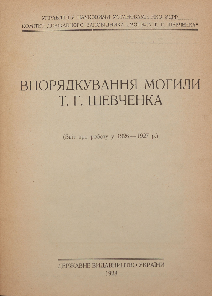 Звіт про роботу по впорядкуванню могили Тараса Шевченка у Каневі за 1926–1927 рр. У 1925 р. територія Тарасової гори стала держаним заповідником. 1926 року було створено комітет, очолюваний М. Скрипником, і проведено урочистий пленум, де йшлося про організацію конкурсу на кращий проєкт пам’ятника Т. Шевченку.