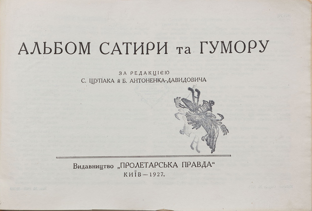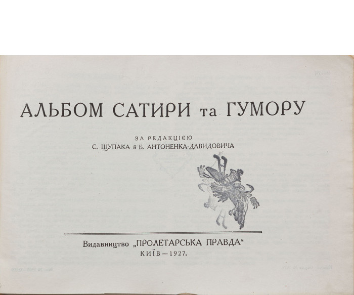«Альбом сатири та гумору» за редакцією Самійла Щупака та Бориса Антоненка-Давидовича був виданий 1927 року видавництвом «Пролетарська правда». Збірку складають прозові твори Володимира Винниченка, Петра Котика (Б. Антоненка-Давидовича), Антіна Хуторяна, С. Лешка, Бульби, Остапа Вишні, вірші Володимира Самійленка, Володимира Ярошенка, Валера Пронози (В. Еллана-Блакитного), Степана Руданського, народні анекдоти, а також карикатури, зокрема з журналів «Червоний Перець», «Смехач», «Бегемот» та «Крокодил».