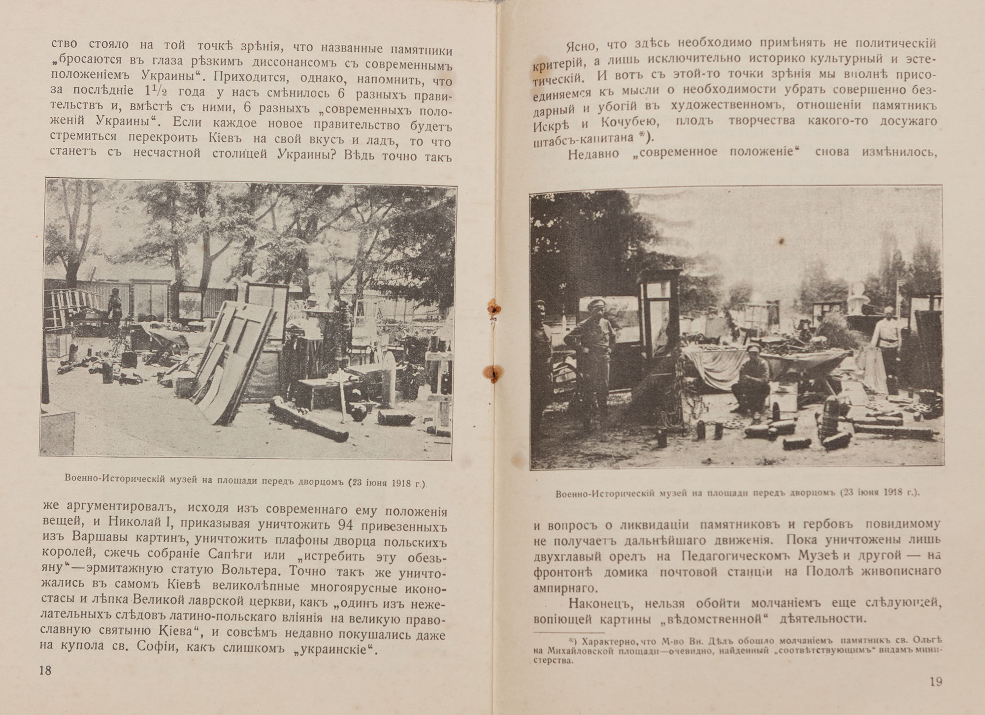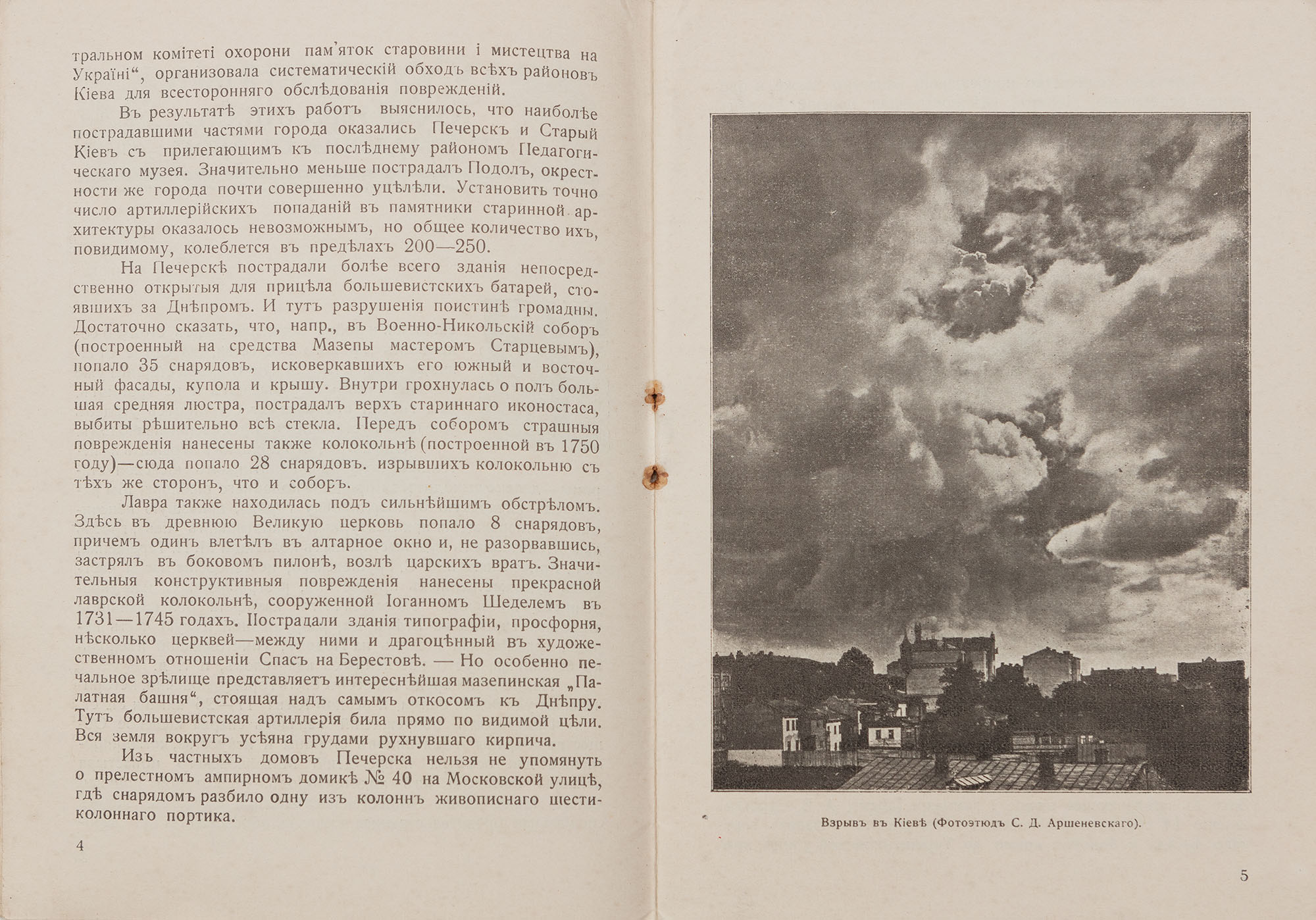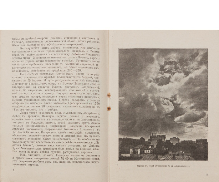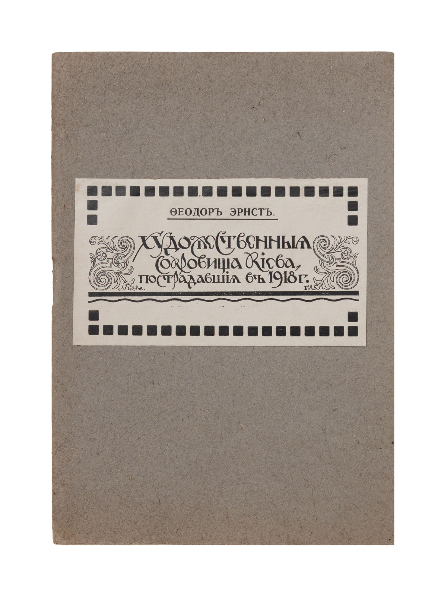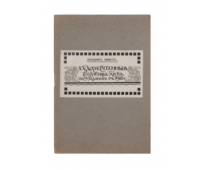 Праця українського історика, мистецтвознавця Федора Ернста (1891–1942) описує стан пам’яток київської старовини, які постраждали під час штурму Києва в січні 1918 року в ході радянсько-української війни. Окрім пам’яток архітектури неабиякої шкоди зазнали мистецькі колекції Михайла Терещенка, Василя Кричевського та Михайла Грушевського.