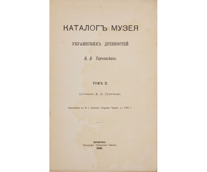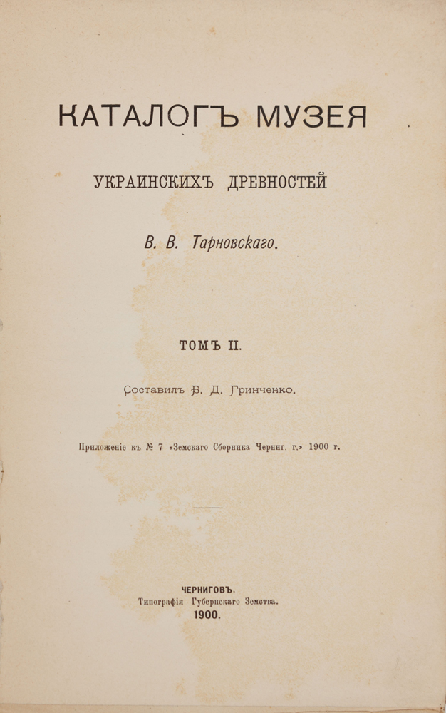 Каталогъ Музея украинскихъ древностей В. В. Тарновскаго: [в 2 т.] Томъ ІІ / составилъ Б. Д. Гринченко // Приложеніе къ № 7 «Земскаго Сборника Черниг. г.» 1900 г.
