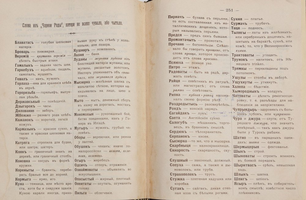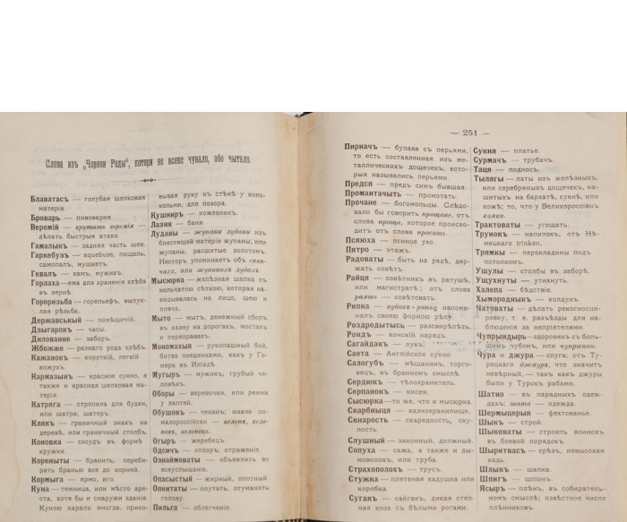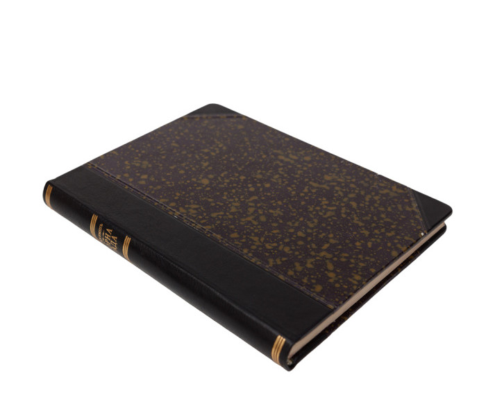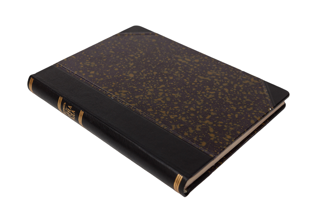 В індивідуальній складеній («мармуровий» папір, шкіра) палітурі. Орнаментально-шрифтове тиснення золотом на корінці. Потертості та незначні забруднення. На титульному аркуші та с. 17, 35, 252 печатки «Шестопал А. О.».