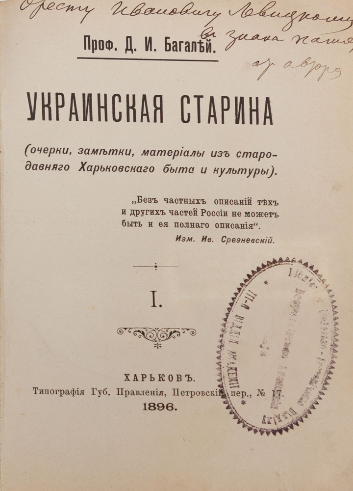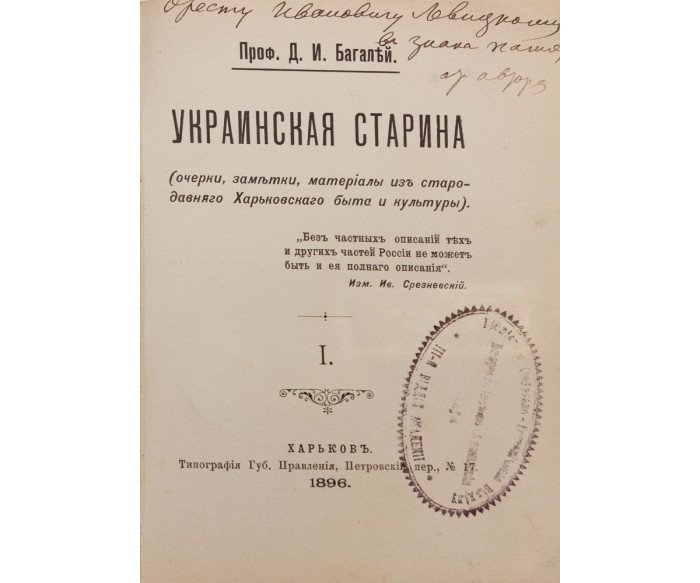 Провенанс: на титульному аркуші дарчий напис автора: «Оресту Ивановичу Левицкому въ знакъ памяти от автора».