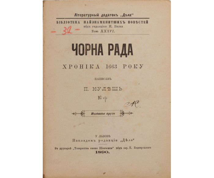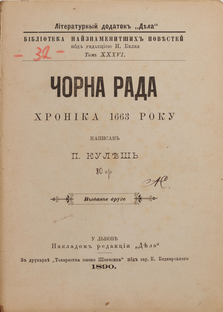 *У Львовѣ: Накладомъ редакціи «Дѣла»; Зъ друкарнѣ «Товариства имени Шевченка», 1890. — Выданье друге. — 239 c. — (Літературный додатокъ «Дѣла»; Бібліотека найзнаменитшихъ повѣстей подъ редакцією И. Белея, томъ ХХХVI). — 18,2 × 13,5 × 1,1 см.