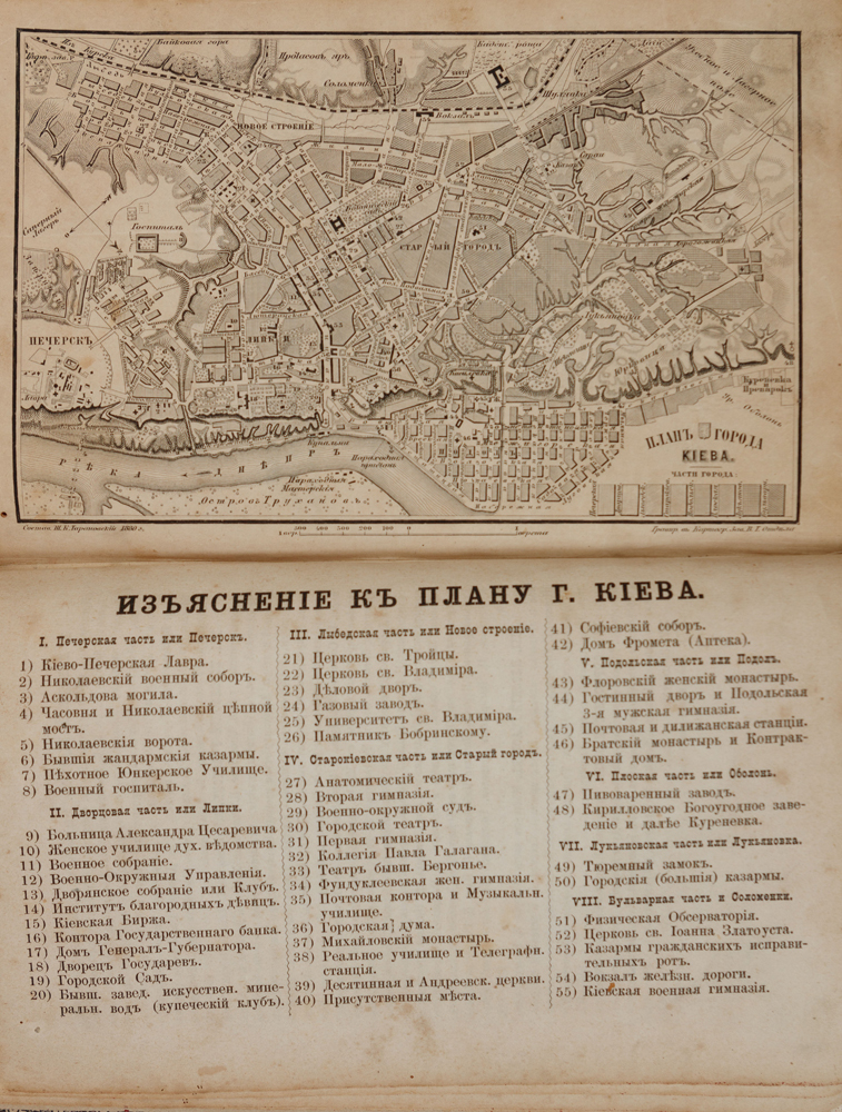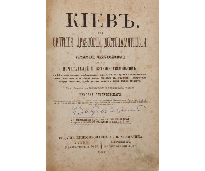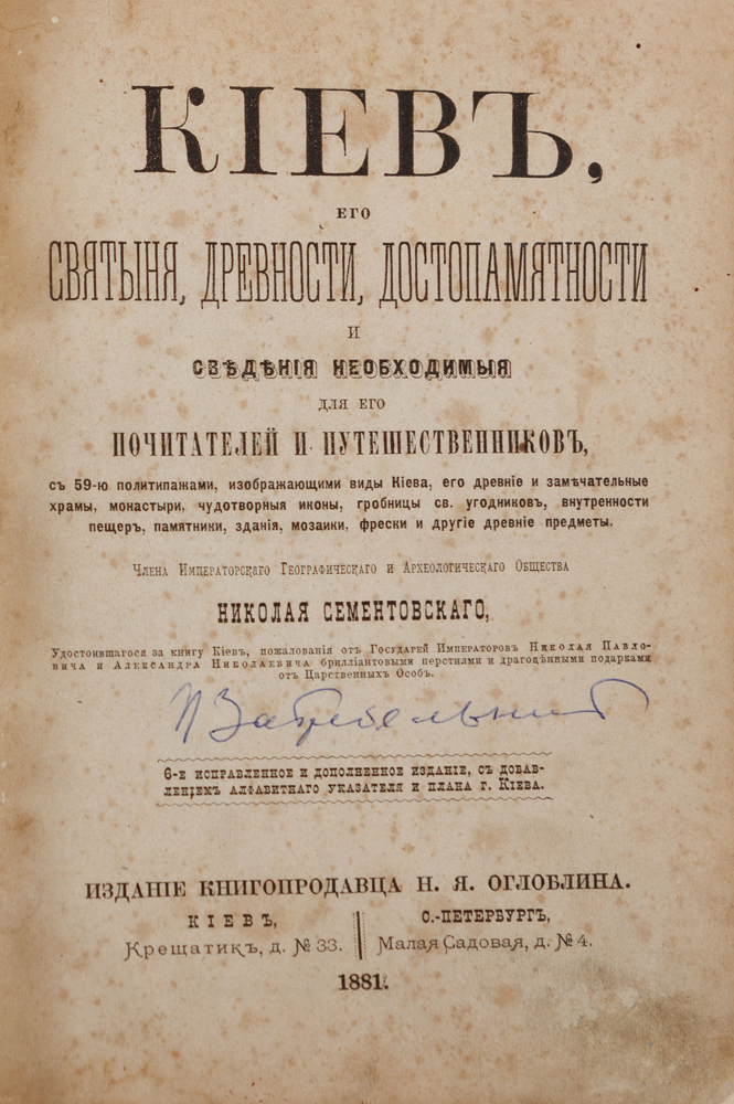Кіевъ — С.-Петербургъ: Изданіе книгопродавца Н. Я. Оглоблина; Печатано въ Типографіи Штаба Кіевскаго Военнаго Округа, 1881. — 6-е исправленное и дополненное изданіе, съ добавленіемъ алфавитнаго указателя и плана г. Кіева. — [1] л., VI с., [1] л., 264 с., [1] л. план: илл. — 21,4 × 15 × 2,5 см.