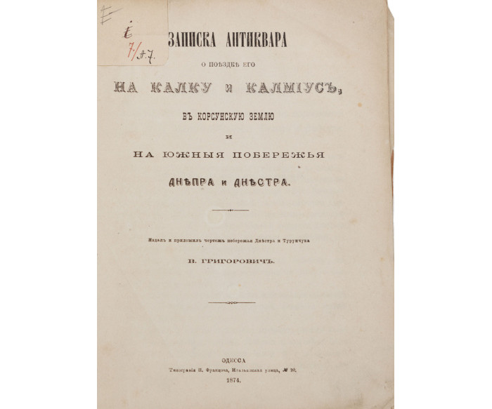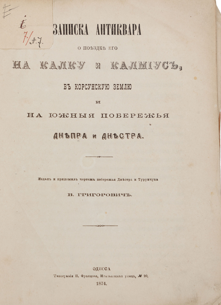 [Григорович В. И.] Записки антиквара о поѣздкѣ его на Калку и Калміусъ, въ Корсунскую землю и на Южныя побережья Днѣпра и Днѣстра / Издалъ и приложилъ чертежъ побережья Днѣстра и Турунчука В. Григоровичъ.