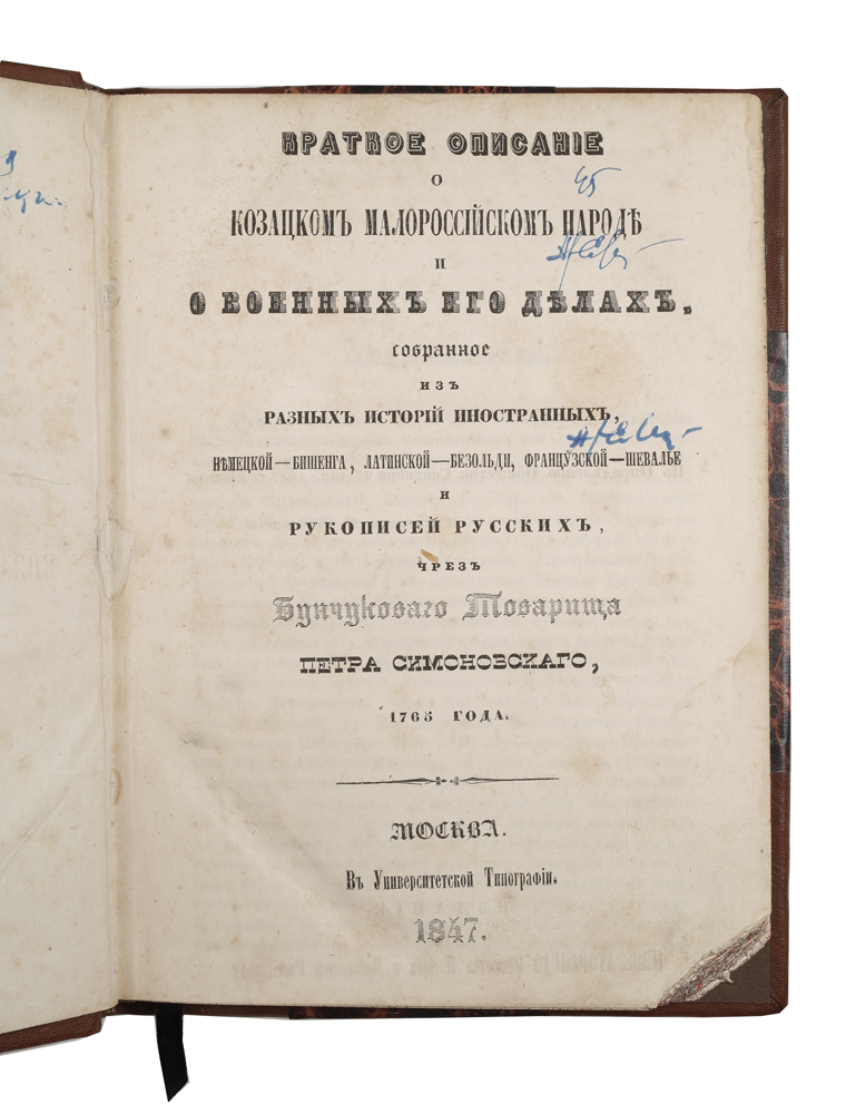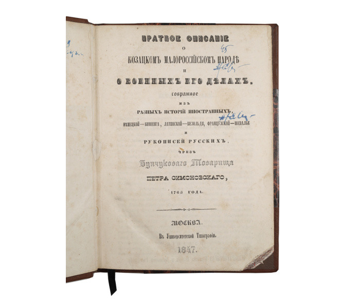 Собранное изъ разныхъ исторій иностранныхъ, нѣмецкой — Бишенга, латинской — Безольди, французской — Шевалье и рукописей русскихъ, чрезъ Бунчуковаго Товарища Петра Симоновскаго, 1765 года / изданіе Императорскаго Общества Исторіи и Древностей Россійскихъ.