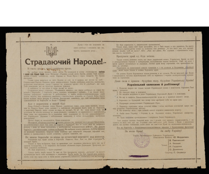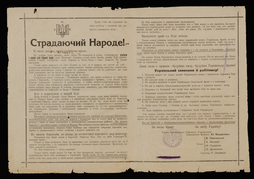 Звернення Радомиського Районного Українського Повстанчого Комітету під головуванням українського військового діяча, підполковника Армії УНР Юліана Мордалевича (1896 — ?) до українського селянина та робітника із закликами про розбудову української армії та спротиву більшовицько-комуністичній навалі.