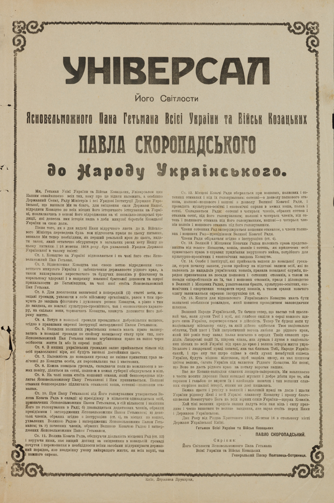 29 квітня 1918 року владу Центральної Ради було повалено, а Павла Скоропадського проголошено гетьманом Української Держави. Одразу постало питання відродження козацтва, і вже у перших законодавчих актах Скоропадського — «Грамоті до всього українського народу» та «Законах про тимчасовий державний устрій України» — козаки визначаються як окрема категорія громадян. Влітку 1918 року велася попередня робота по відродженню козацтва, восени ідею почали втілювати в життя, проте єдно сті та одностайності серед творців козацької реформи не було. 16 жовтня 1918 року було оприлюднено Універсал гетьмана Скоропадського: «… Для зміцнення сили Держави Нашої, відродити Козацтво по всіх місцях його історичного істнування на Україні…» У пресі публікувалися телеграми зі зборів «селян-хліборобів», в яких йшлося про цілковиту підтримку гетьмана. Однак подальшому формуванню козацьких частин завадила зміна воєнно-політичної ситуації в Українській Державі. Вже у середині листопада 1918 року Скоропадський заговорив про федерацію з небільшовицькою Росією, згодом спалахнуло повстання Директорії, і 14 грудня 1918 року гетьман зрікся влади.
