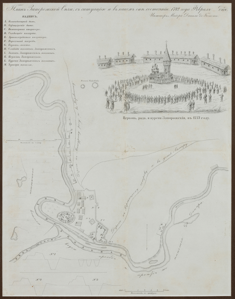 Планъ Запорожской Сѣчи, съ ситуаціею и въ какомъ онѣ состояніи. 1742 года Февраля дня. Инженеръ-Маіора Данила де-Боскета. [Зображення з написом:] Церковъ, рада, и курени Запорожскія въ 1773 году.