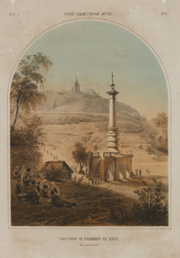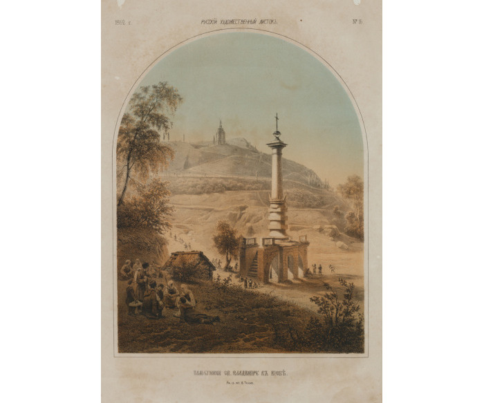 На літографії художника і графіка Василя Тімма (1820–1895) зображено пам’ятник Магдебурзькому праву в Києві (Пам’ятник хрещення Русі, нижній пам’ятник святому Володимиру). Монумент вважається найстарішим з існуючих пам’ятників у Києві. На обрії зображено пам'ятник Володимиру Великому, споруджений у 1853 році. «Русскій художественный листокъ В. Тимма» — друкована збірка, журнал, що видавався В.Тіммом з 1851 по 1862 роки у Санкт-Петербурзі.