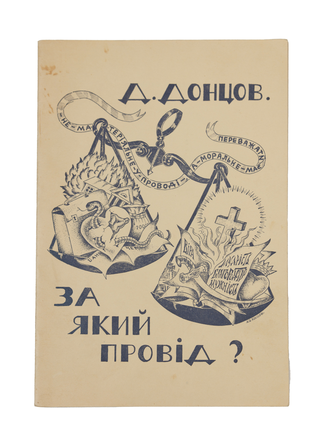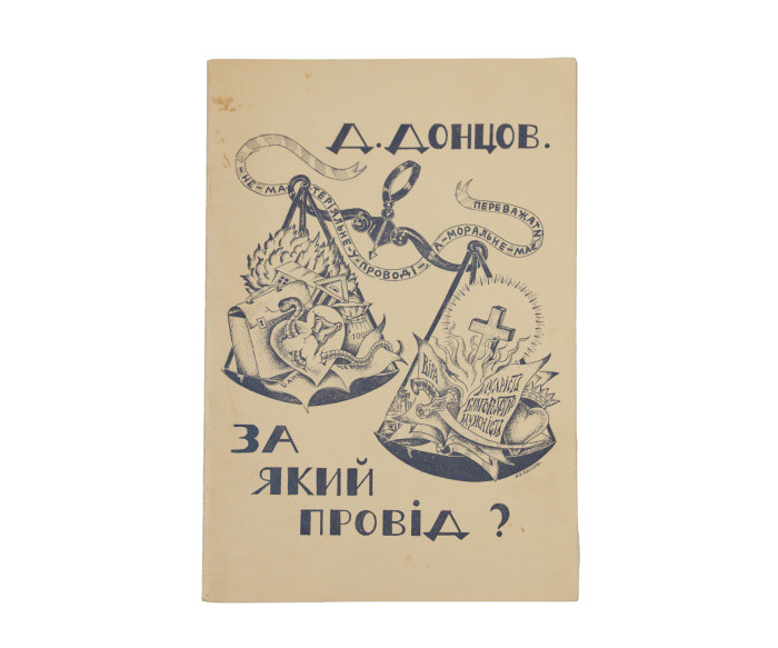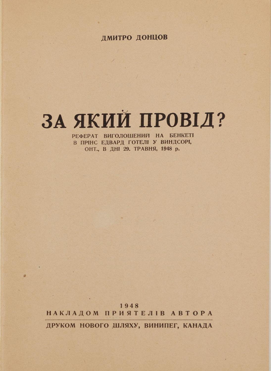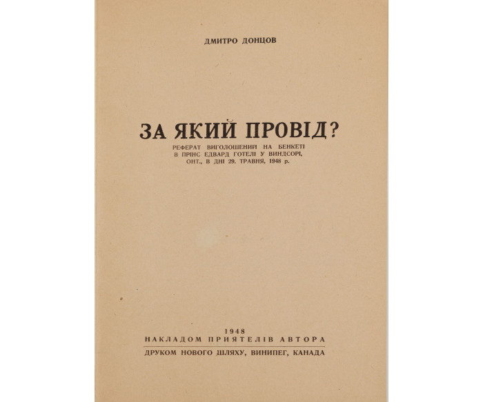 Перше видання брошури «За який провід?» українського політичного діяча, теоретика українського націоналізму Дмитра Донцова (1883–1973), де висвітлено важливість провідної верстви України. Брошура видана як текст реферату, виголошеного на бенкеті в «Прінс Едвард готелі», у Віндзорі (Канада) 29 травня 1948 р.