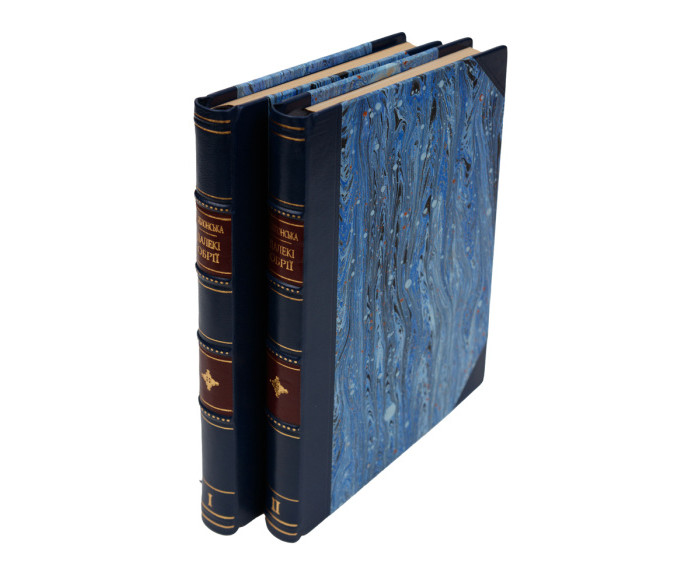 В індивідуальних складених (шкіра, «мармуровий» папір) палітурах. Орнаментально-шрифтове тиснення золотом на корінцях. Збережено видавничі обкладинки. Потертості та пожовтіння паперу. На обкладинці другого тому — печатка Джорджа Стефанскі. Проект обкладинки — Жан Уден.