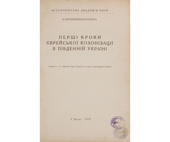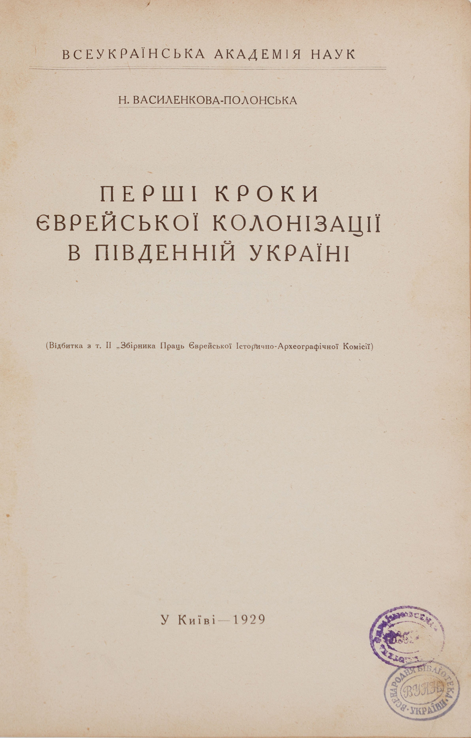 Василенкова-Полонська Н. Перші кроки єврейської колонізації в південній Україні.
