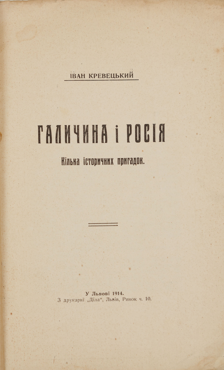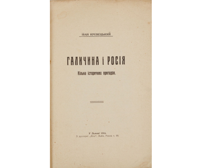 Праця українського історика, громадського діяча Івана Кревецького (1883–1940) присвячена геополітичному змаганню за Галичину між Австро-Угорською та Російською імперіями. Автор зазначає, що Росія здавна прагне захопити всі українські землі, які колись входили до Київської держави.