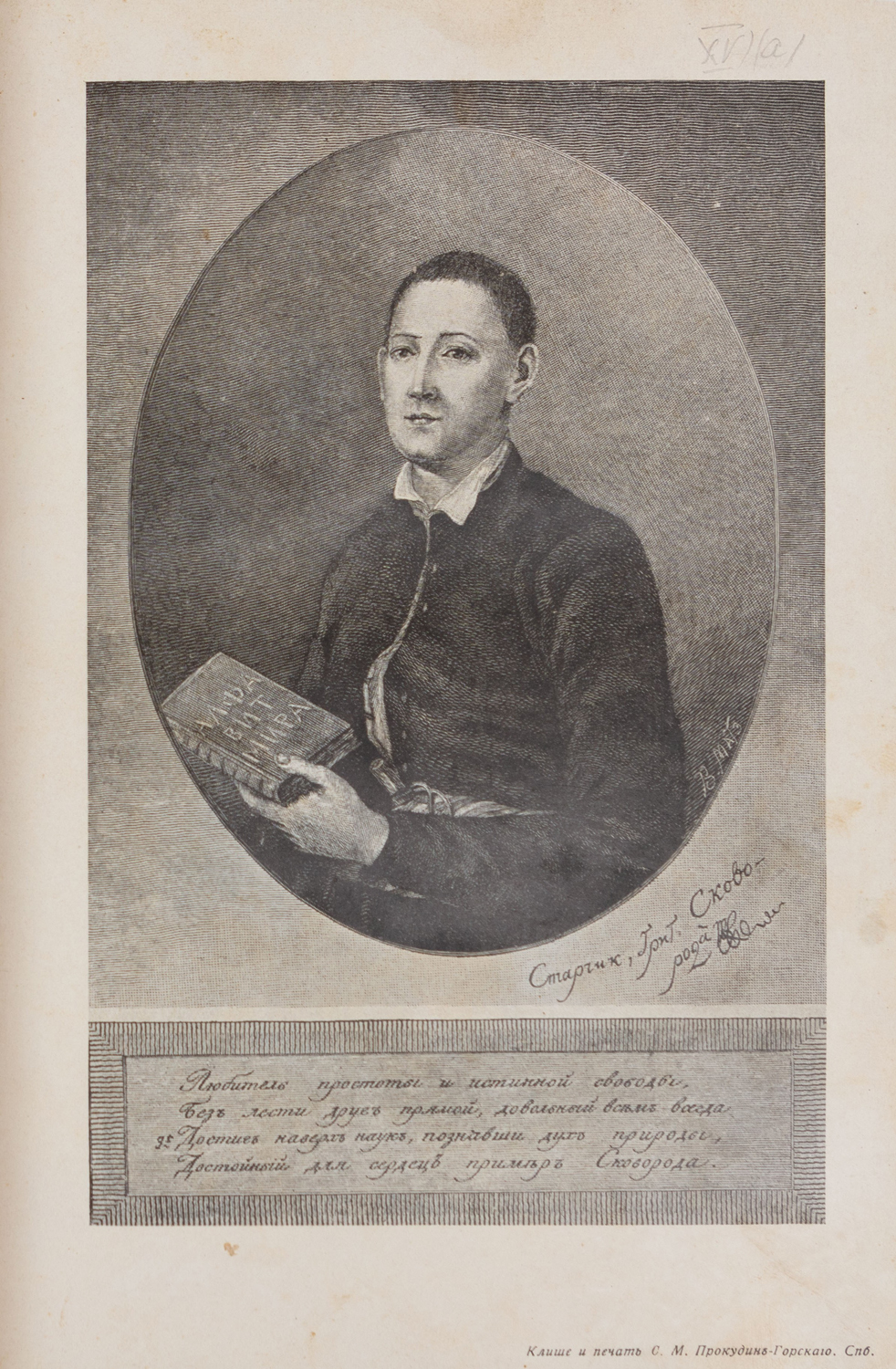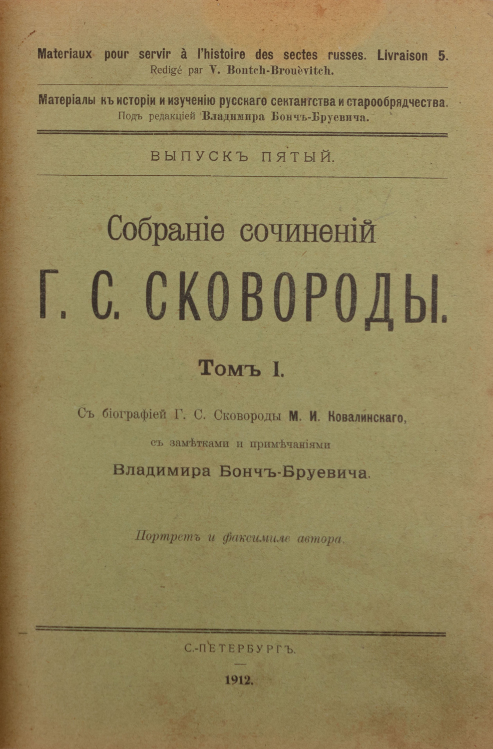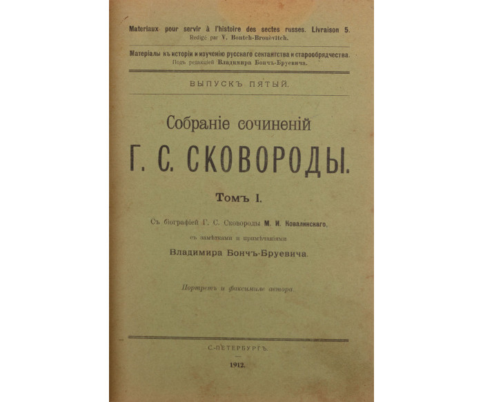 Съ біографіей Г. С. Сковороды М. И. Ковалинскаго, съ замѣтками и примѣчаніями Владимира Бончъ-Бруевича. Портретъ и факсимиле автора.