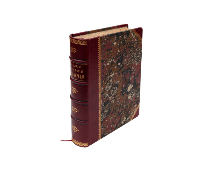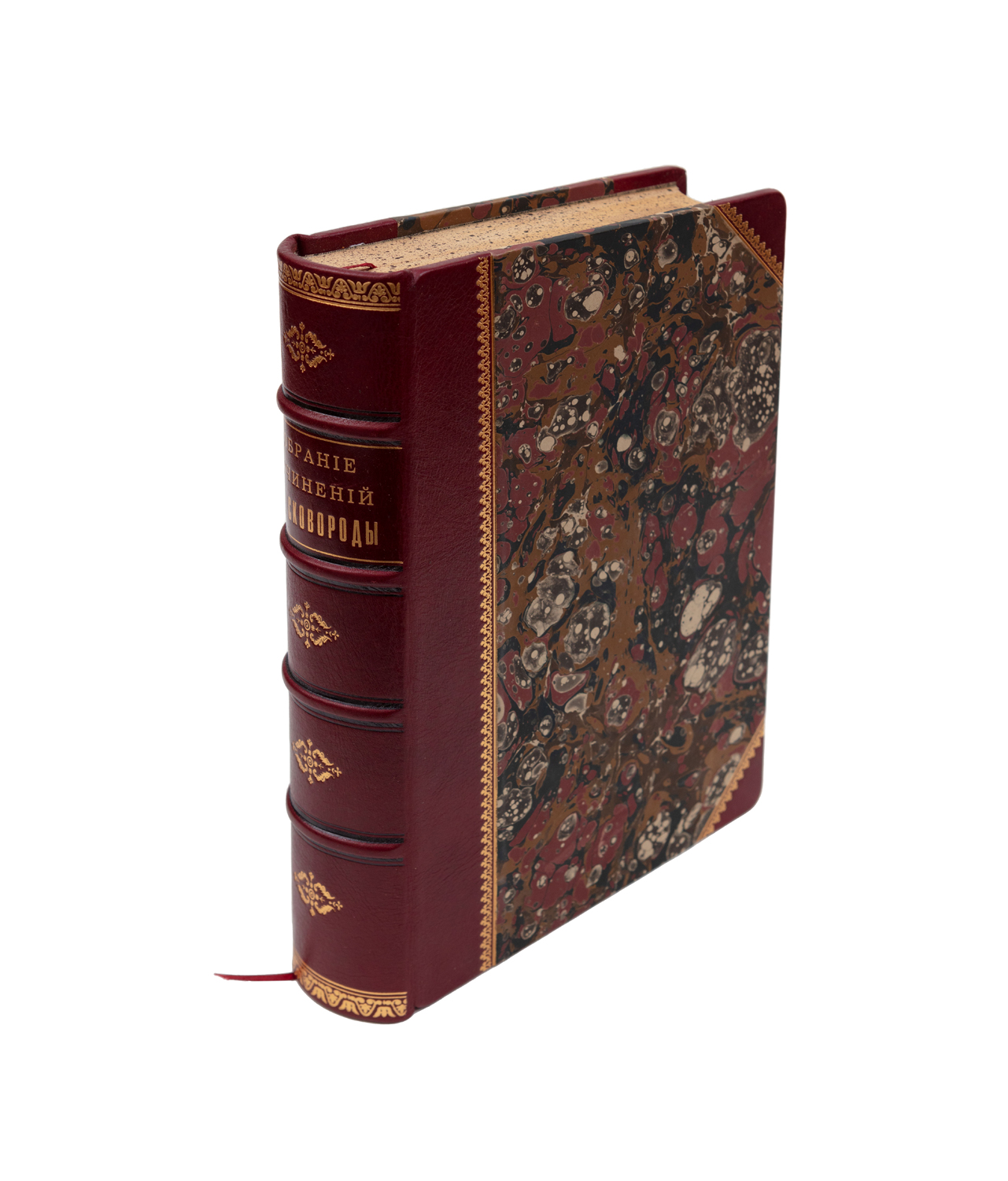 В індивідуальній складеній (шкіра, «мармуровий» папір) палітурі з орнаментально-шрифтовим тисненням золотом. Збережено оригінальну обкладинку. Незначні потертості та забруднення. Портрет і факсиміле виконано в художній фотоцинкографії С. Прокудіна-Горського. На титульному аркуші, с. 77 і 265 печатки «Библіотека для служащихъ вегетаріанскихъ столовыхъ О-ва трезвенниковъ Колоскова в Москвѣ».