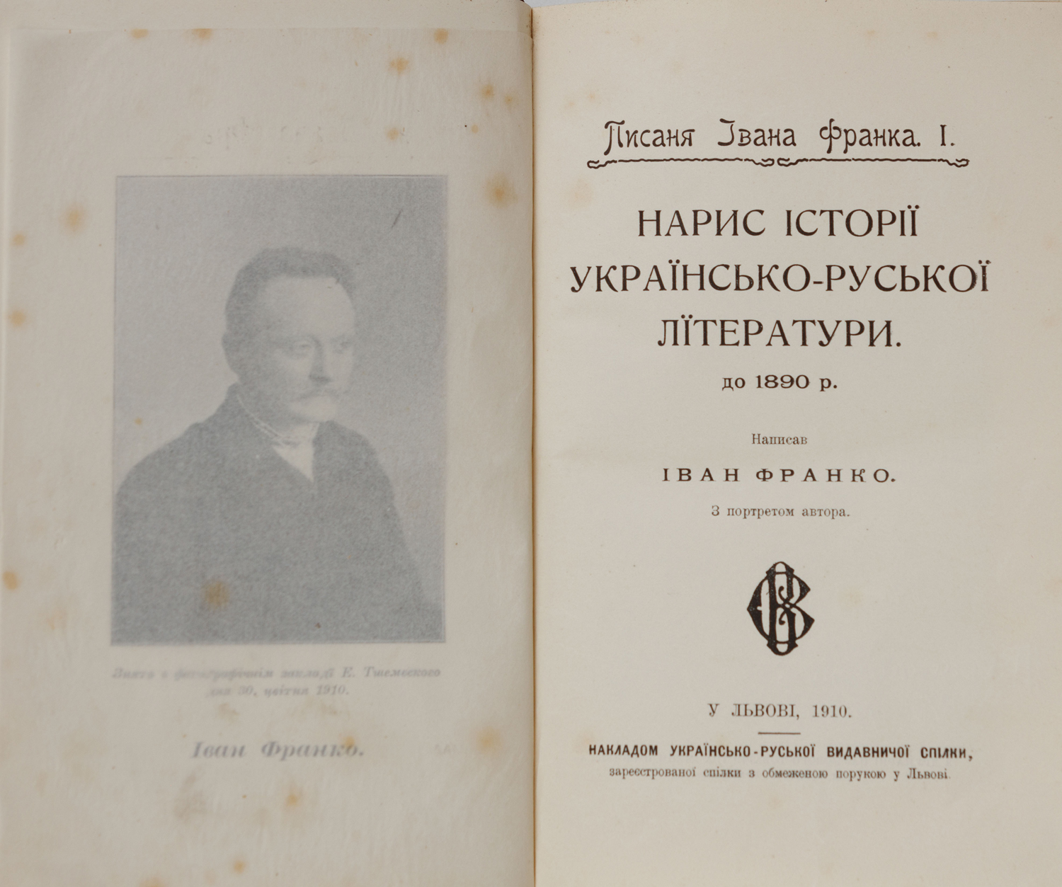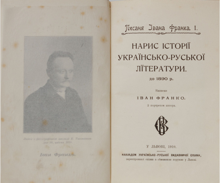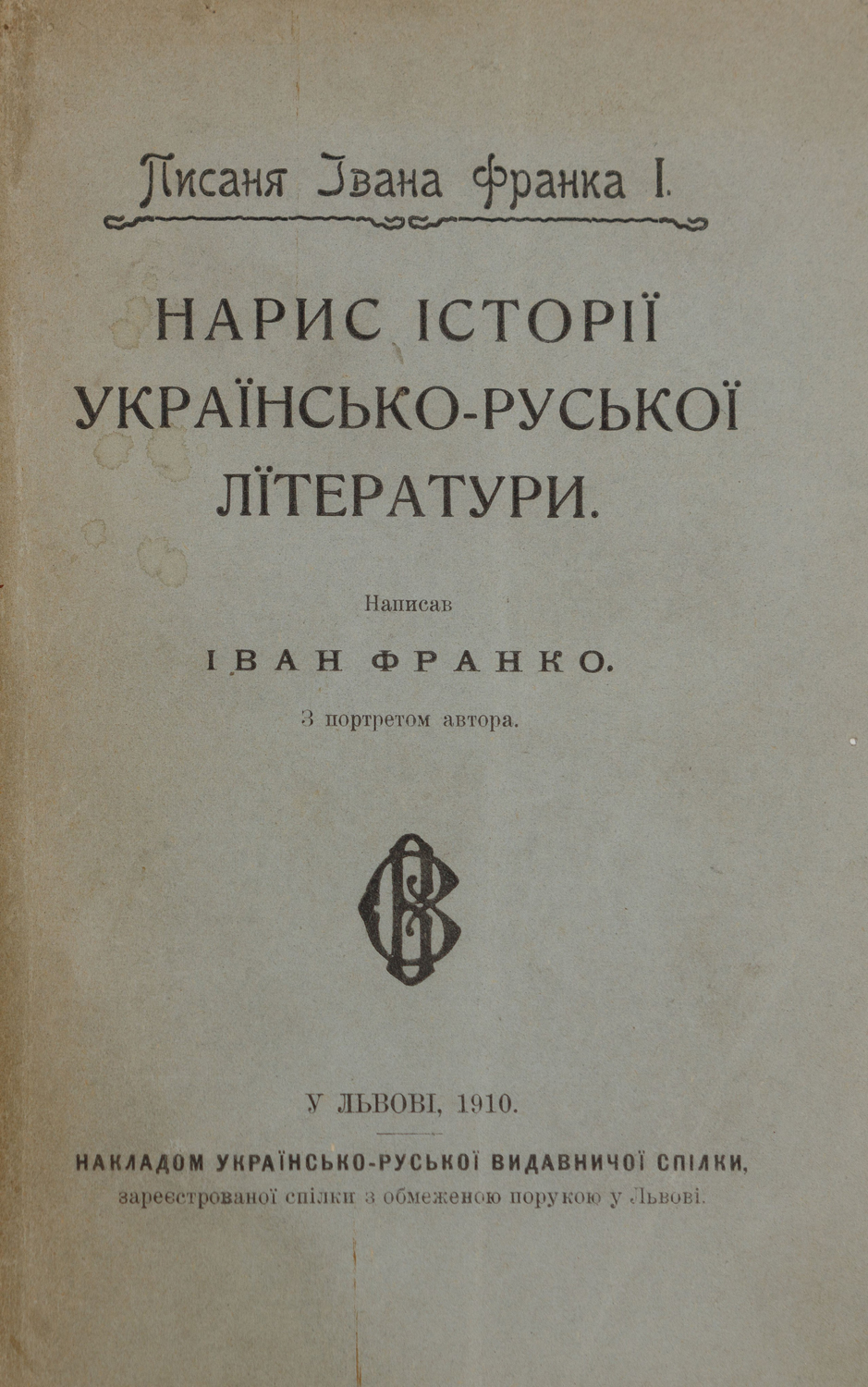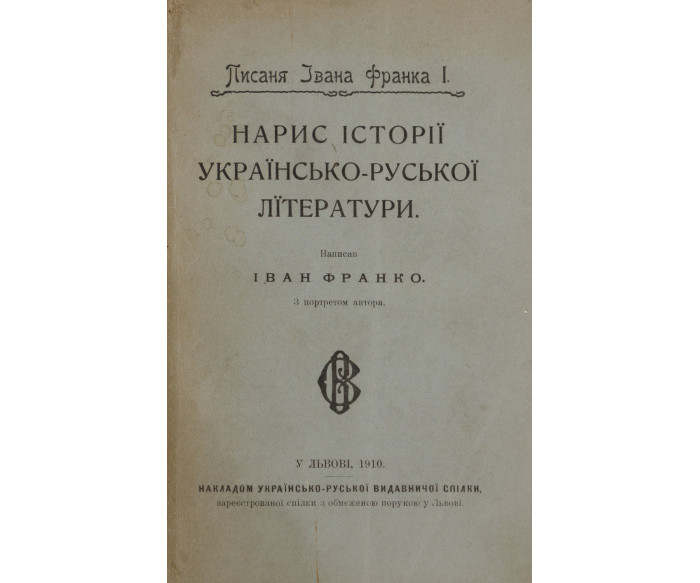 Львів: Накладом Українсько-руської видавничої спілки; Друк. Наукового тов-ва ім. Шевченка, 1910. — [1] арк. фронт., VI с., 444 с. — 19,8 × 12,5 × 2,1 см.