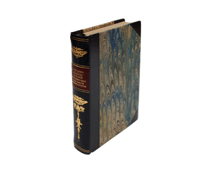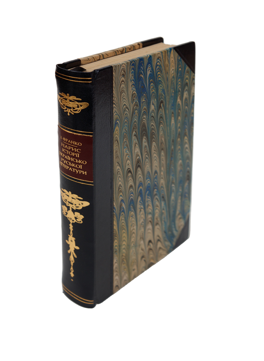 В індивідуальній складеній (шкіра, «мармуровий» папір) палітурі. Орнаментально-шрифтове тиснення золотом на корінці. Збережено оригінальну передню боковинку. Незначні потертості та забруднення. Підпис М. Драґана олівцем на звороті титулу та його ж власницька печатка на звороті фронтиспису.